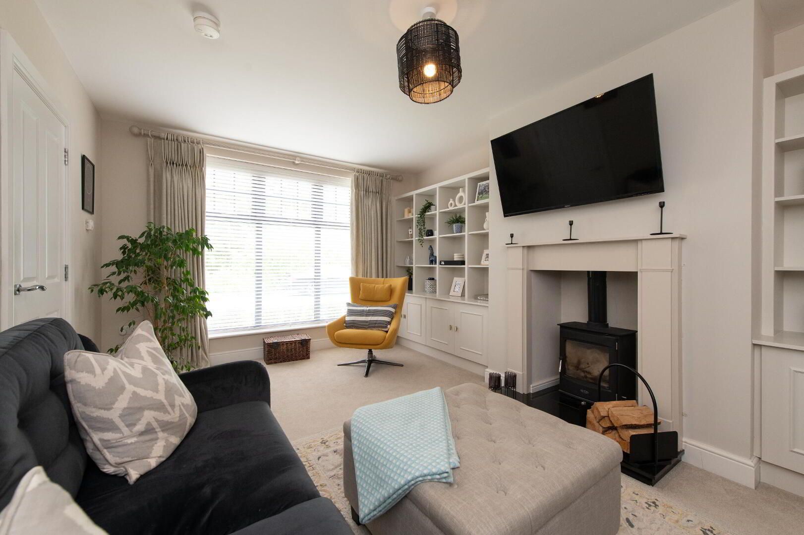 LOUNGE 17' 4" x 11' 11" (5.28m x 3.63m) Log burning stove with feature surround, range of built in cupboards and shelving, wired for flat screen