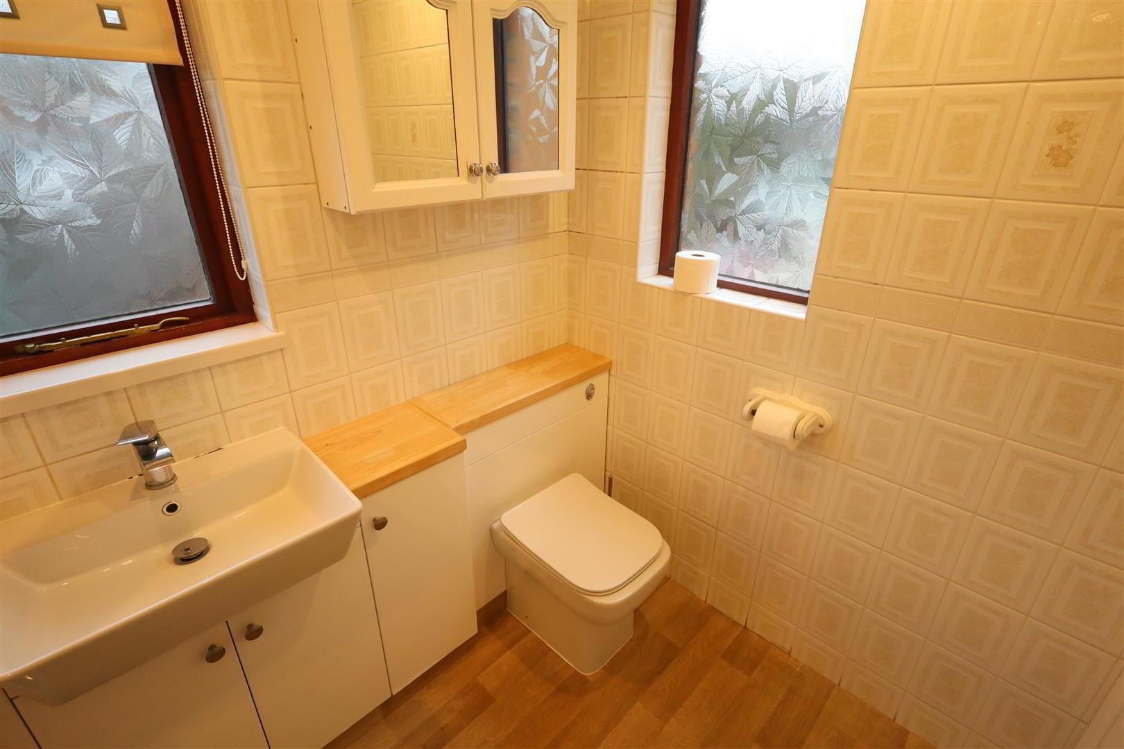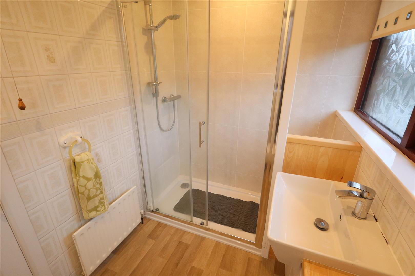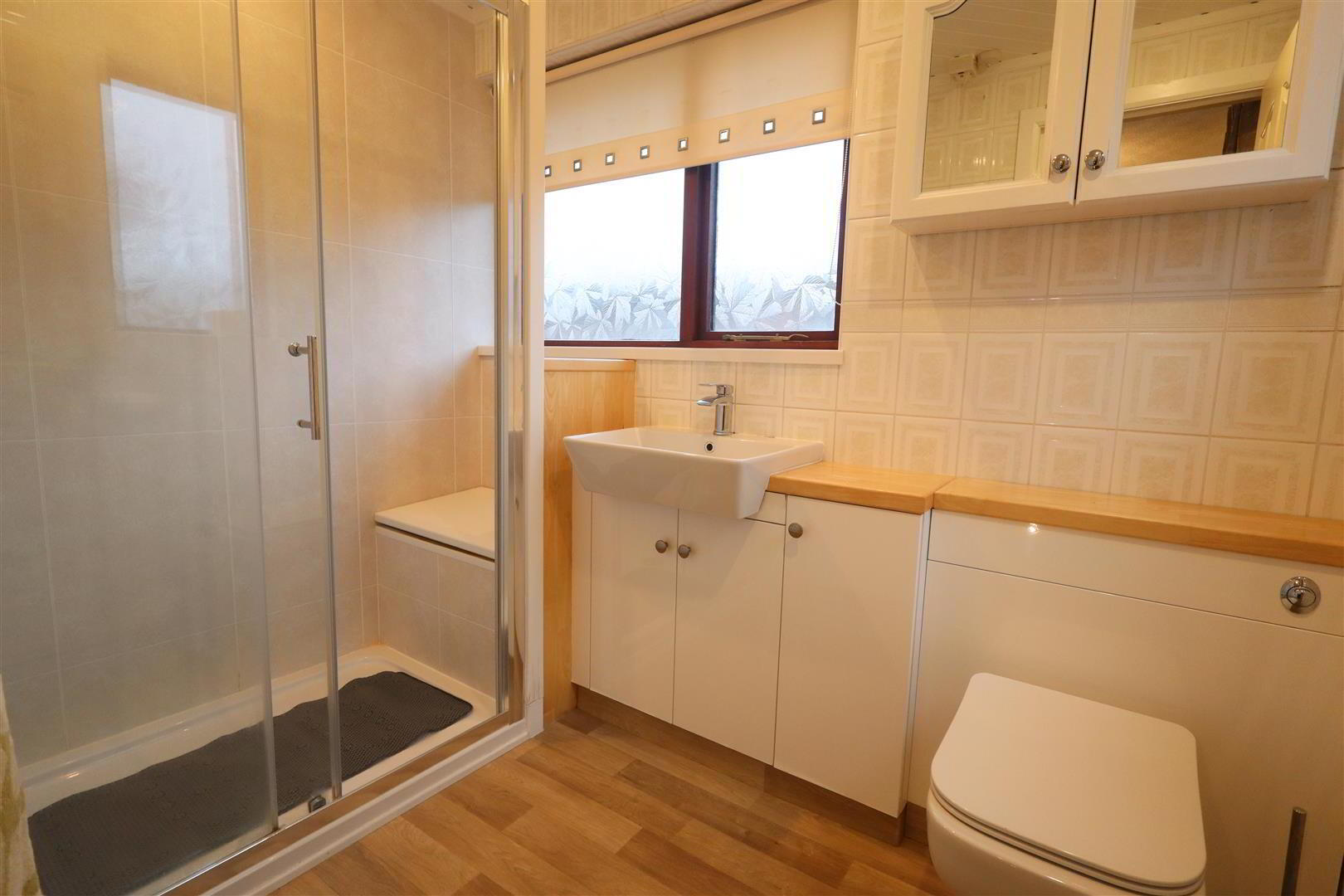 - Shower unit, thermostatic controlled shower, glazed shower screen, built in storage, low flush W/C, vanity sink unit with mixer tap, panelled ceiling, downlighters, wall tiling
