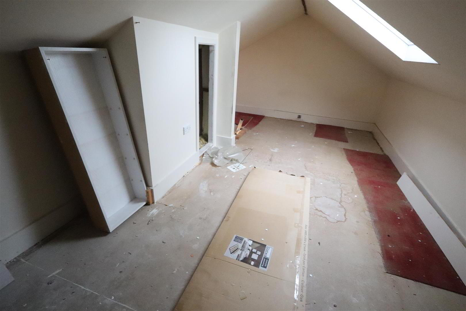 - Storage cupboard with Worcester gas boiler, access to fully floored roofspace with eave storage, Velux window, eave storage