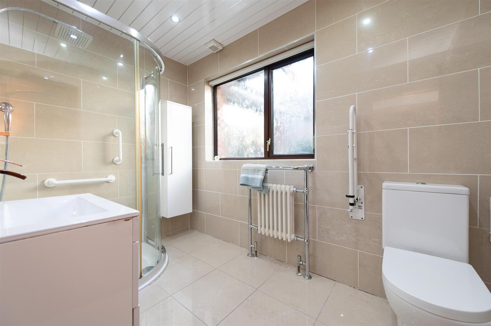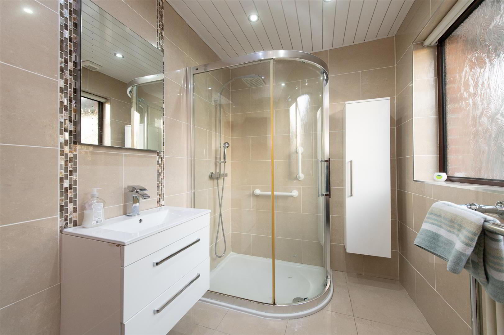 - Glazed shower cubicle with feature rainfall shower and separate handheld shower, vanity unit, low flush W/C, polished porcelain tiled walls and flooring, antique style radiator, PVC panelled ceiling, downlighters, extractor fan