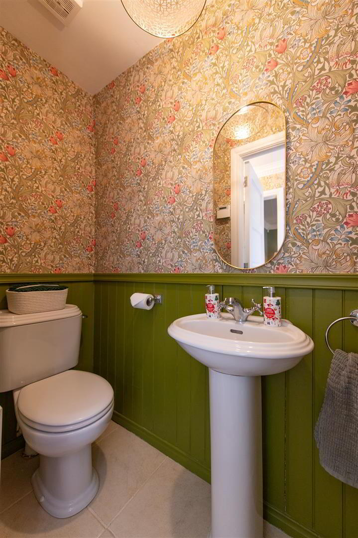- Low flush WC, pedestal wash hand basin, ceramic tiled flooring, panelling, extractor fan