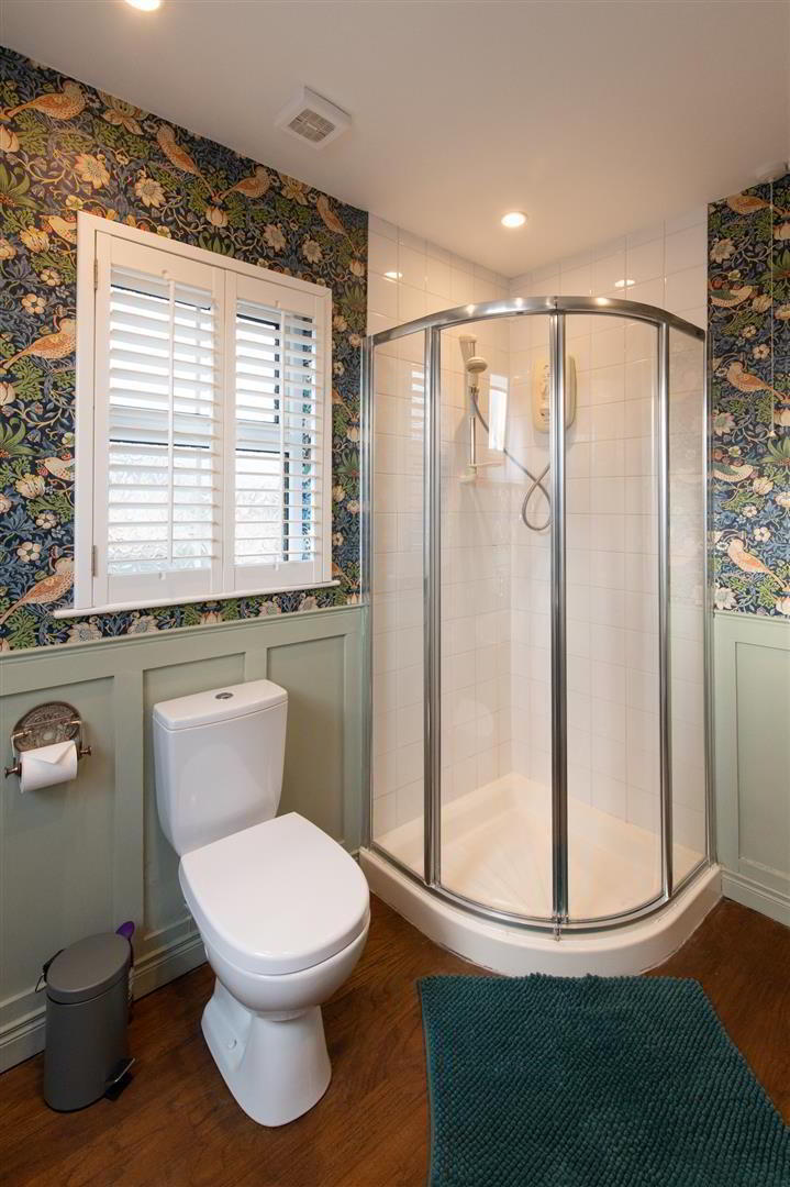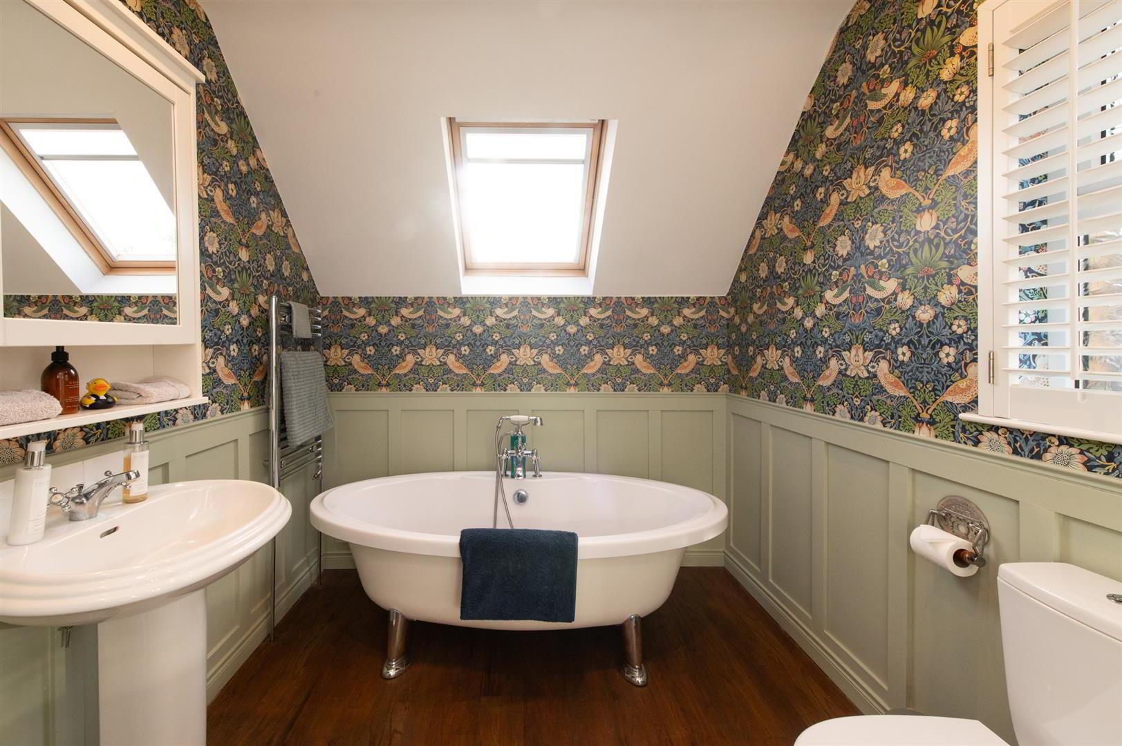 - Modern white suite with roll top bath and mixer taps, telephone hand shower, low flush WC, separate electric shower, polished wood flooring, Velux window, downlighters, extractor fan, panelling