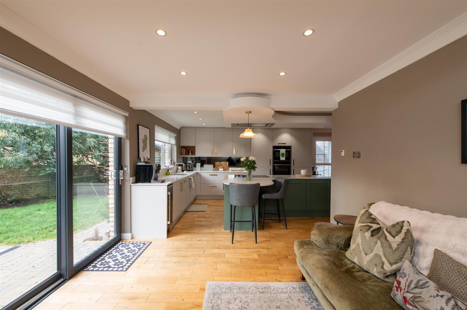 - Parkes Interiors kitchen with range of high and low level units, quartz worksurfaces with matching splashback and mirror splashback, single drainer sink unit with Quooker mixer tap and vegetable sink, integrated dishwasher, inlaid hob unit, built in oven and microwave, fridge and freezer, polished wood flooring, panelling, extractor fan, open plan to: