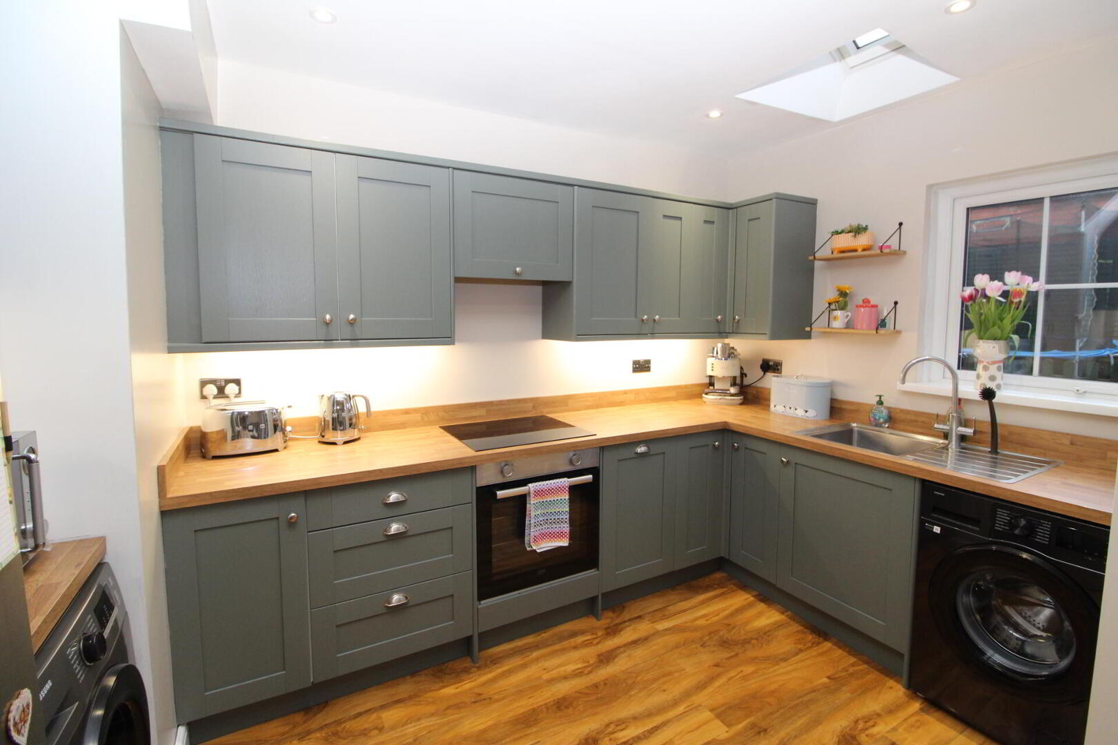 KITCHEN OPEN PLAN TO: 12' 0" (at max) or 9'10 (at min) x 7' 2" (3.66m x 2.18m) Range of high and low level shaker style units, wood effect worksurfaces, built in stainless steel oven and hob unit, single drainer stainless steel sink unit with mixer taps, plumbed for washing machine, extractor fan, downlighters, Velux window, plumbed for dishwasher, through to: