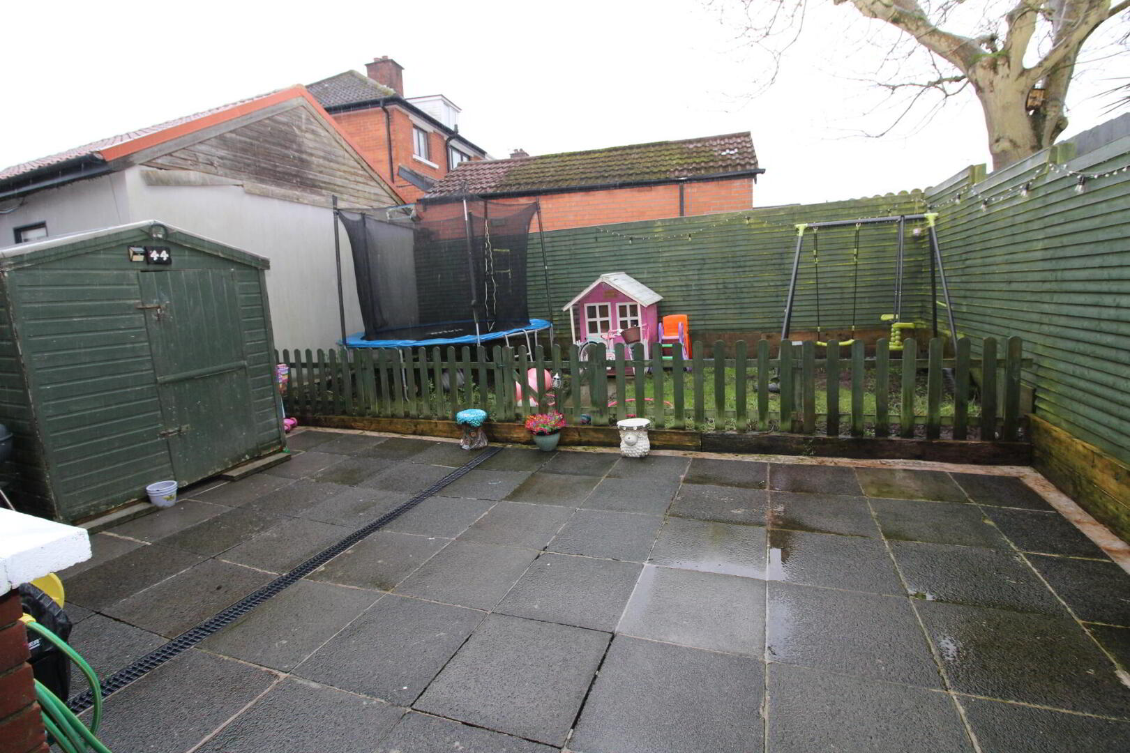 Enclosed paved garden to rear, area in lawn, sleepers, uPVC fascia and rainwater goods, store