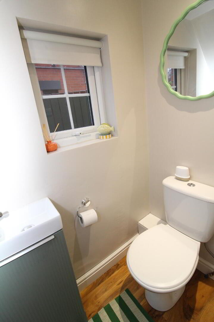 CLOAKS Low flush W/C, vanity unit sink, laminate wood flooring, understairs storage, downlighters