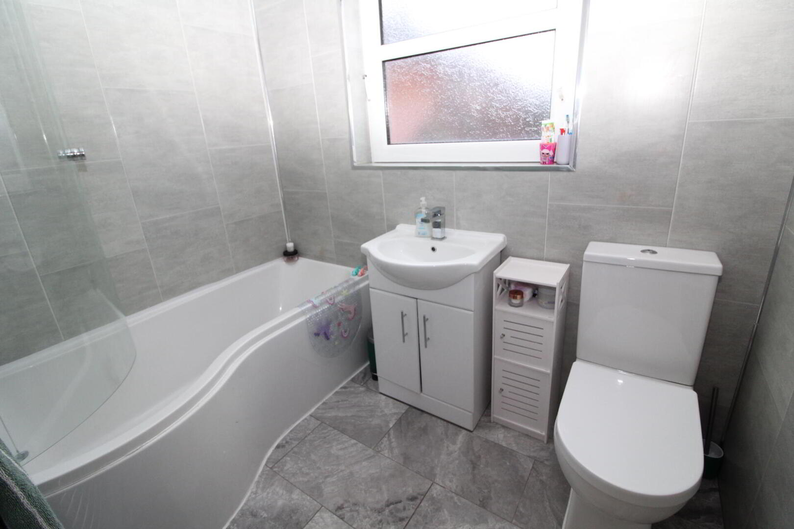 BATHROOM White suite comprising panelled bath, glazed shower screen, thermostatic controlled shower, low flush W/C, vanity unit sink, PVC panelled walls and ceiling, downlighters, chrome heated towel rail