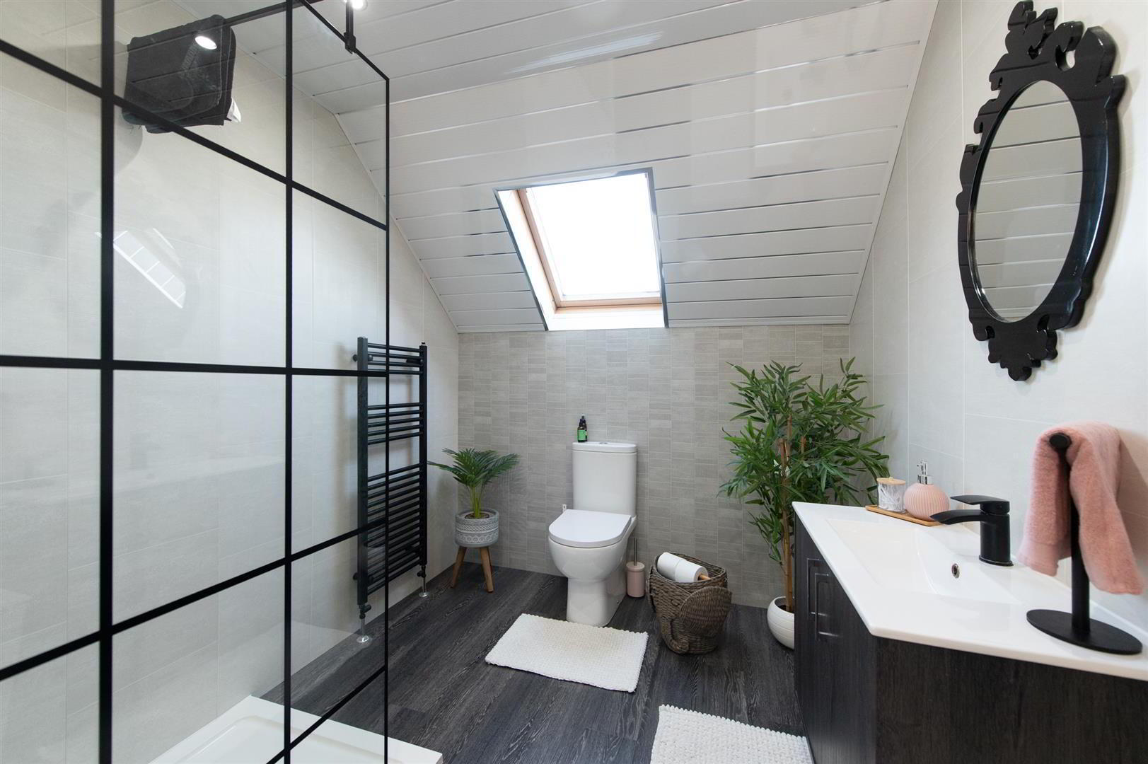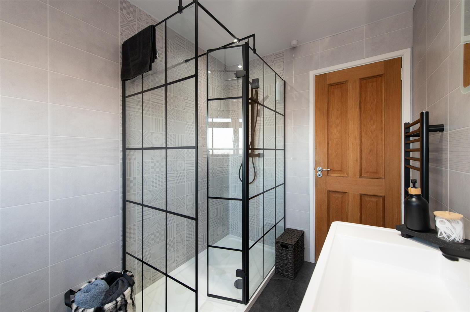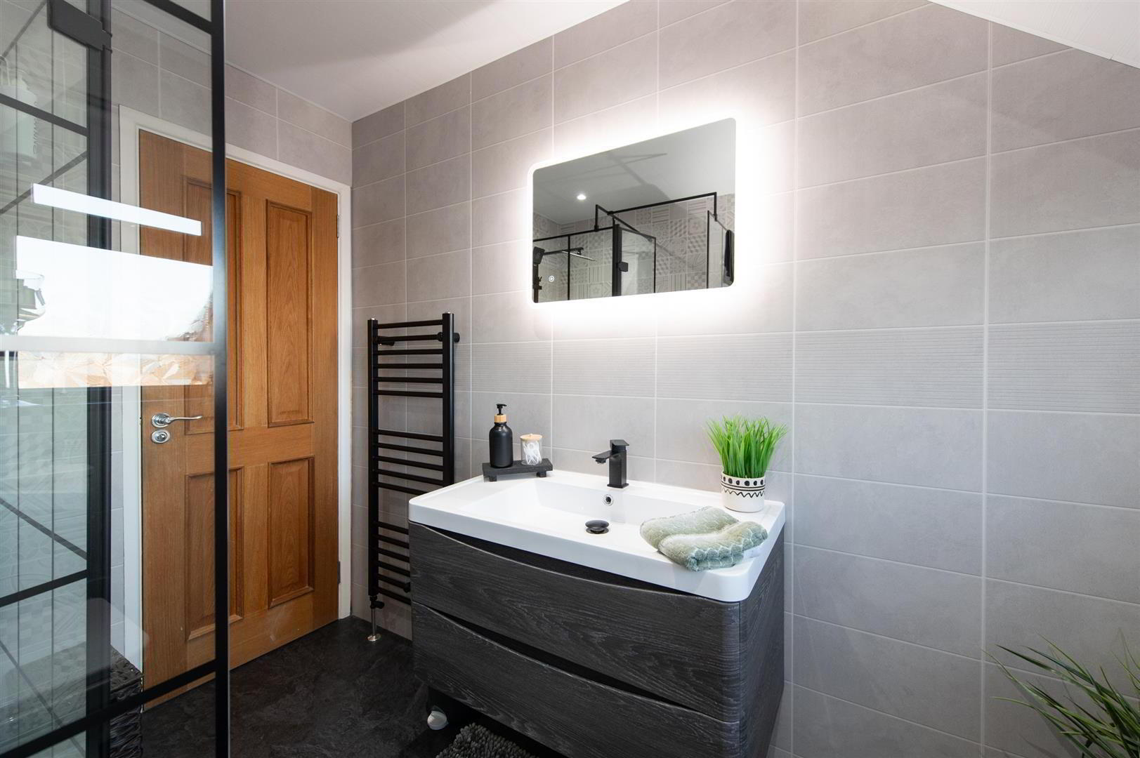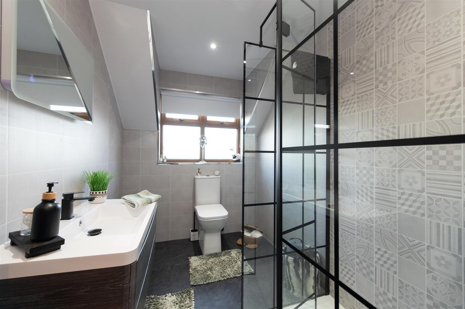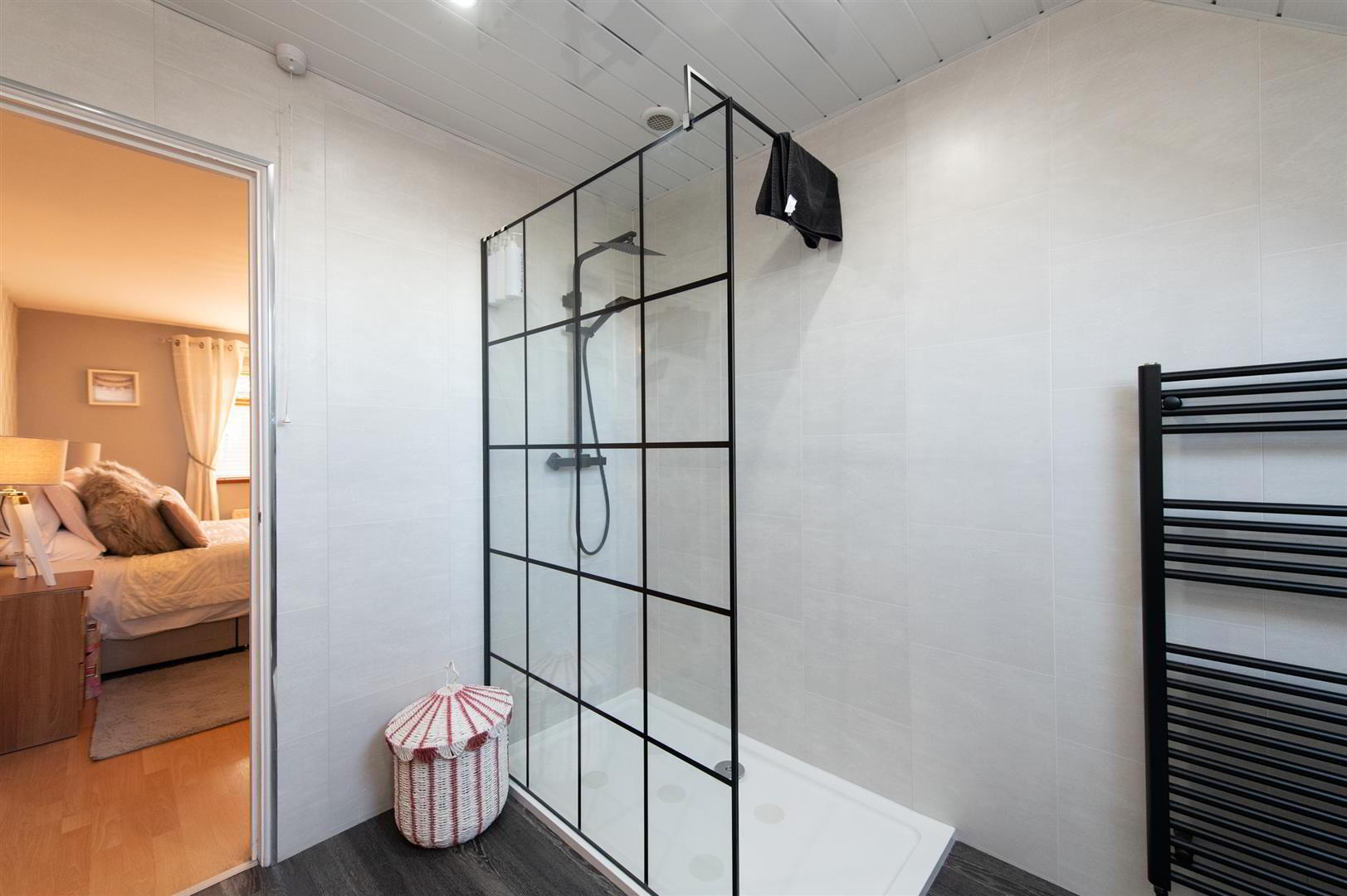 - Low flush W/C, vanity unit with mixer tap, large walk in shower unit with rain shower and hand held shower attachment, uPVC panelling, heated towel rail, laminate wood flooring, Velux window, downlighters, extractor fan