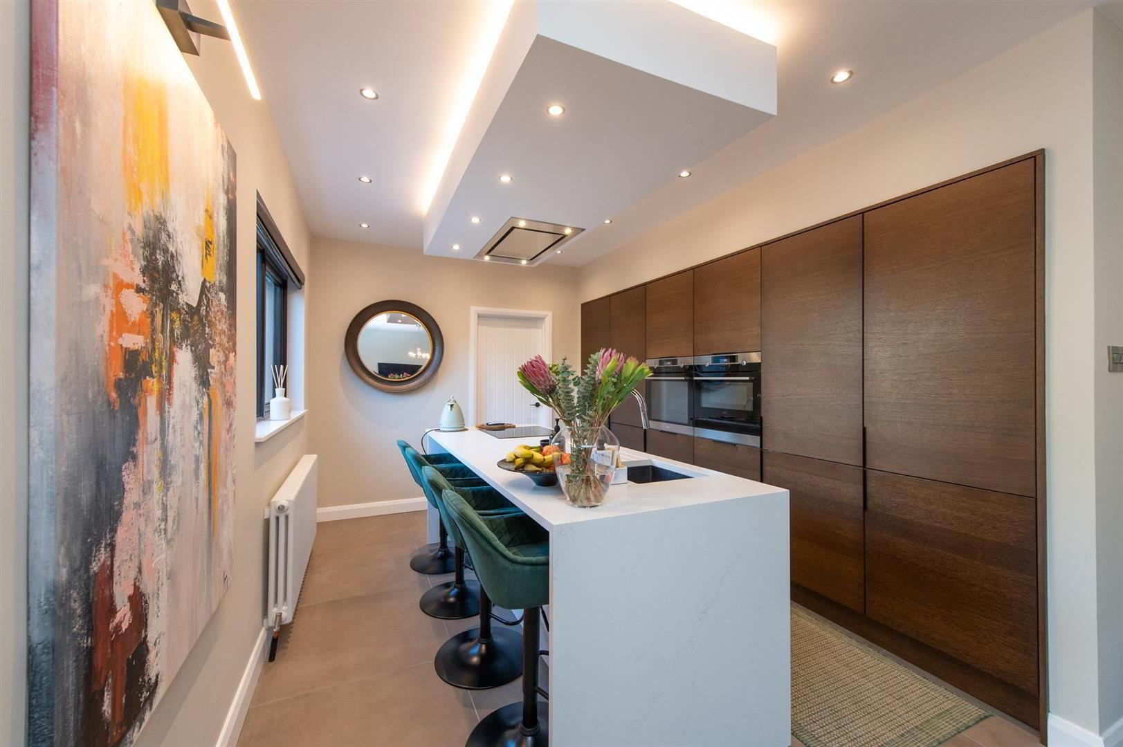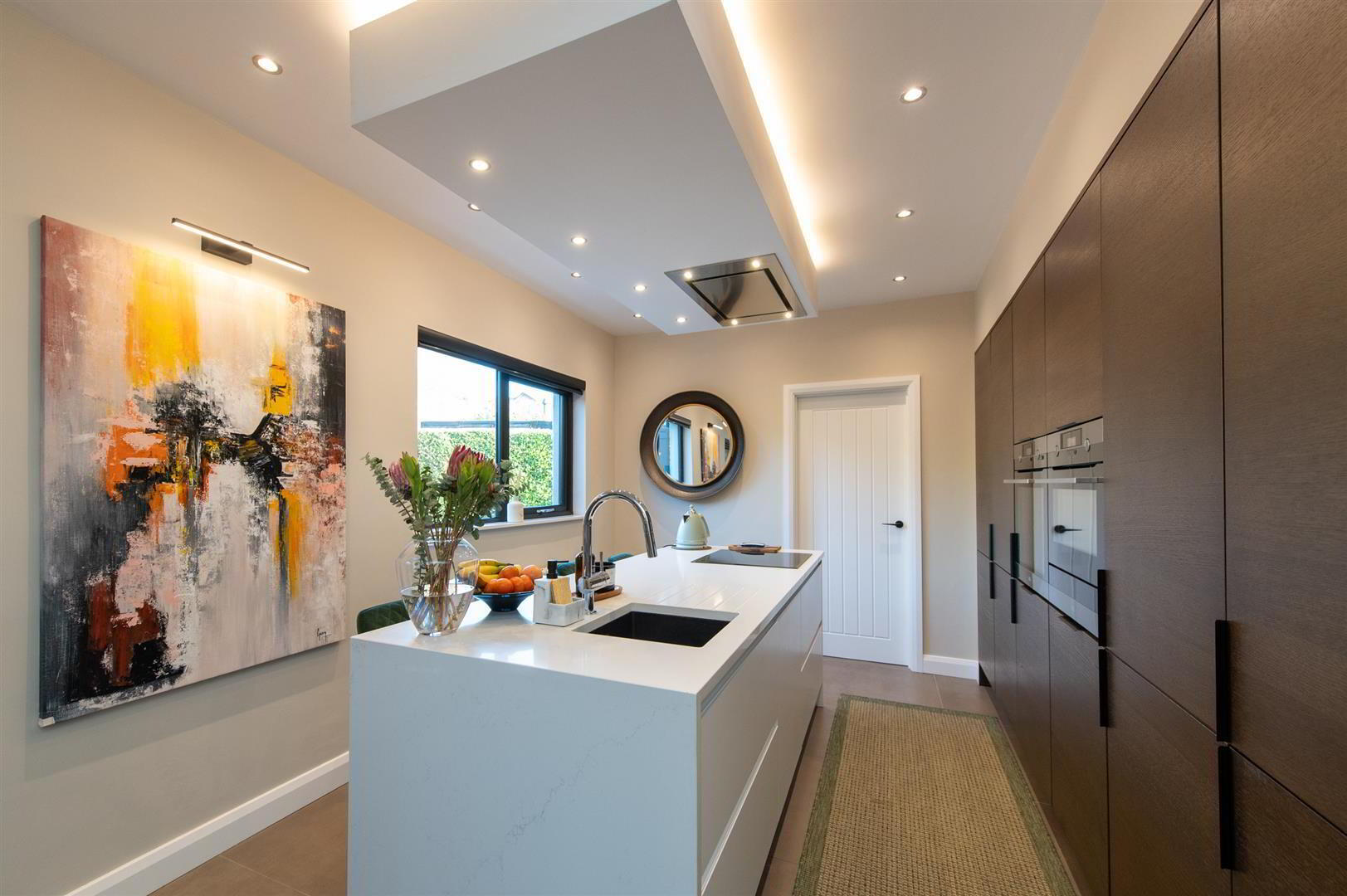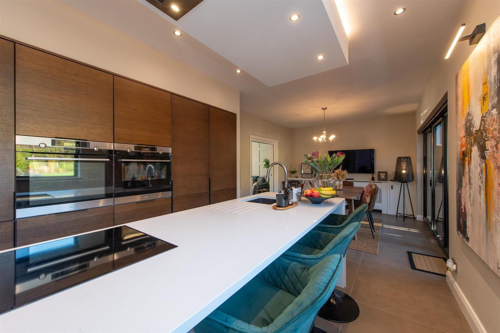 - Luxury fitted kitchen with range of high and low level units, two built in Aeg fan assisted ovens with warming drawers, built in fridge and freezer, island with Quartz solid worksurfaces, incorporate sink unit with drainer, built in dishwasher, built in induction hob with ceiling Airforce extractor fan with feature lighting, electric blinds