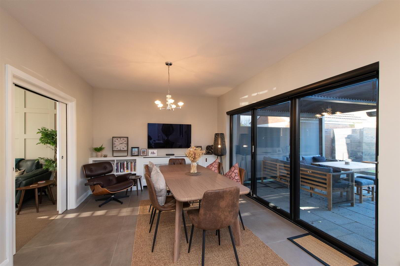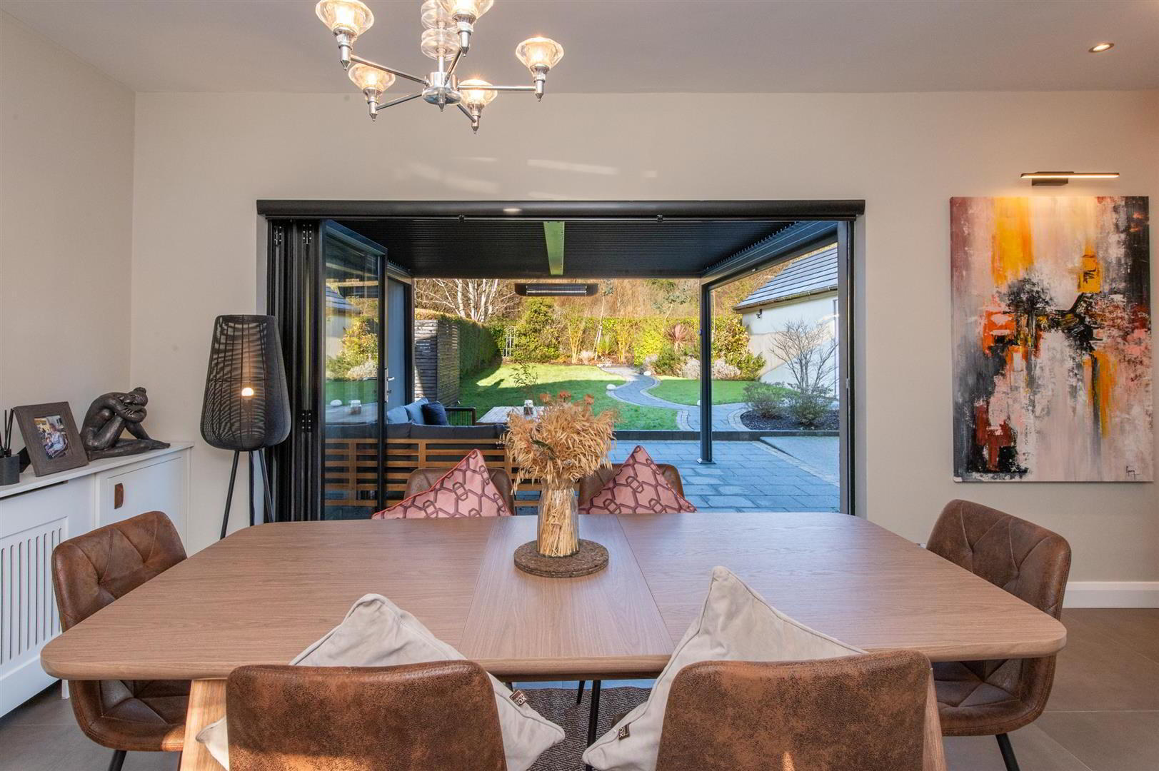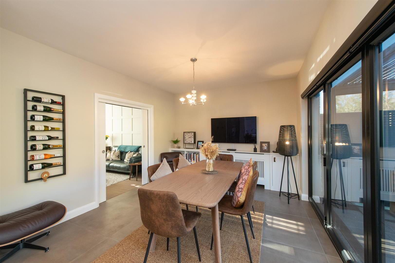 Casual dining area with built in cupboards, wired for flat screen, downlighters, built in folding door with electric blinds to patio area, feature pergola with electric heating, views towards Knockagh - UTILITY ROOM 2.29m x 1.83m