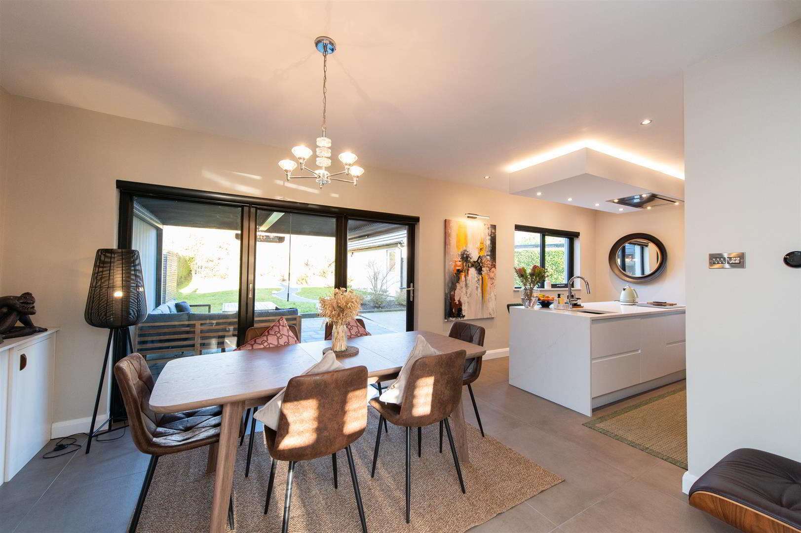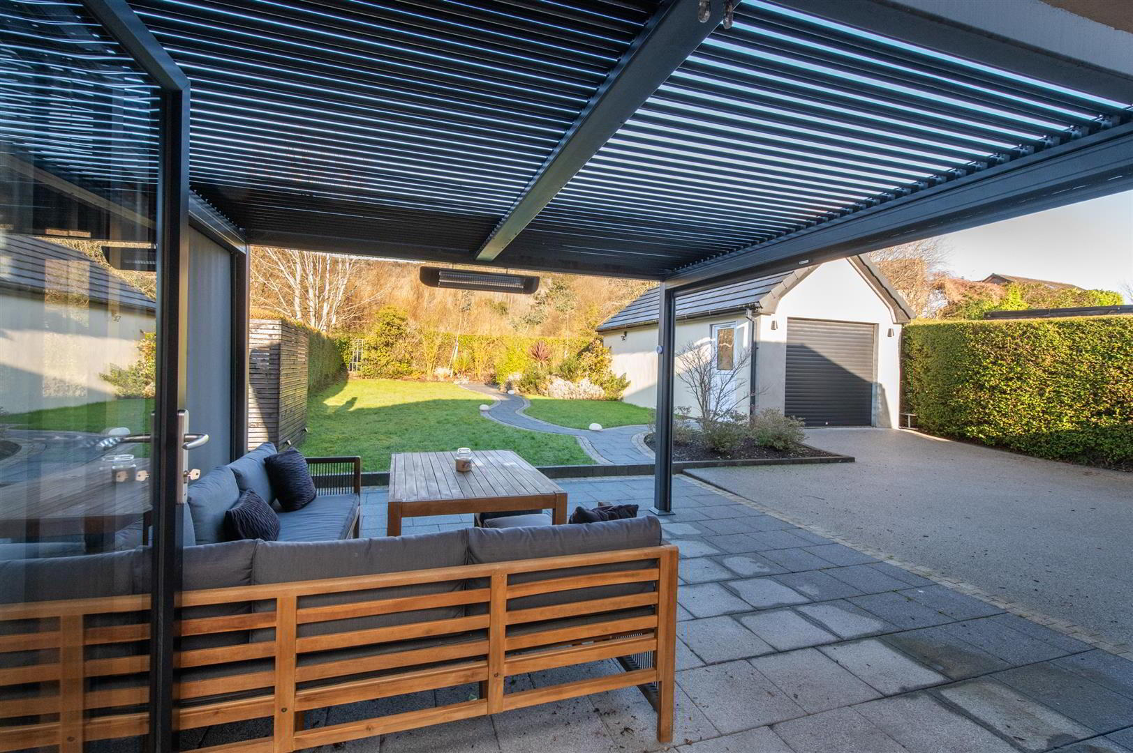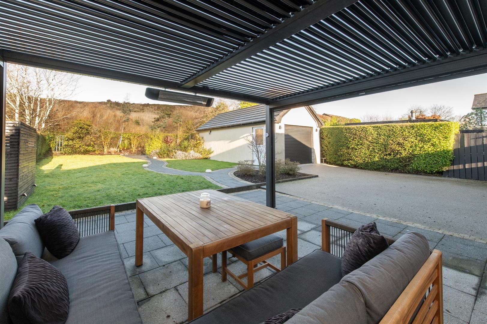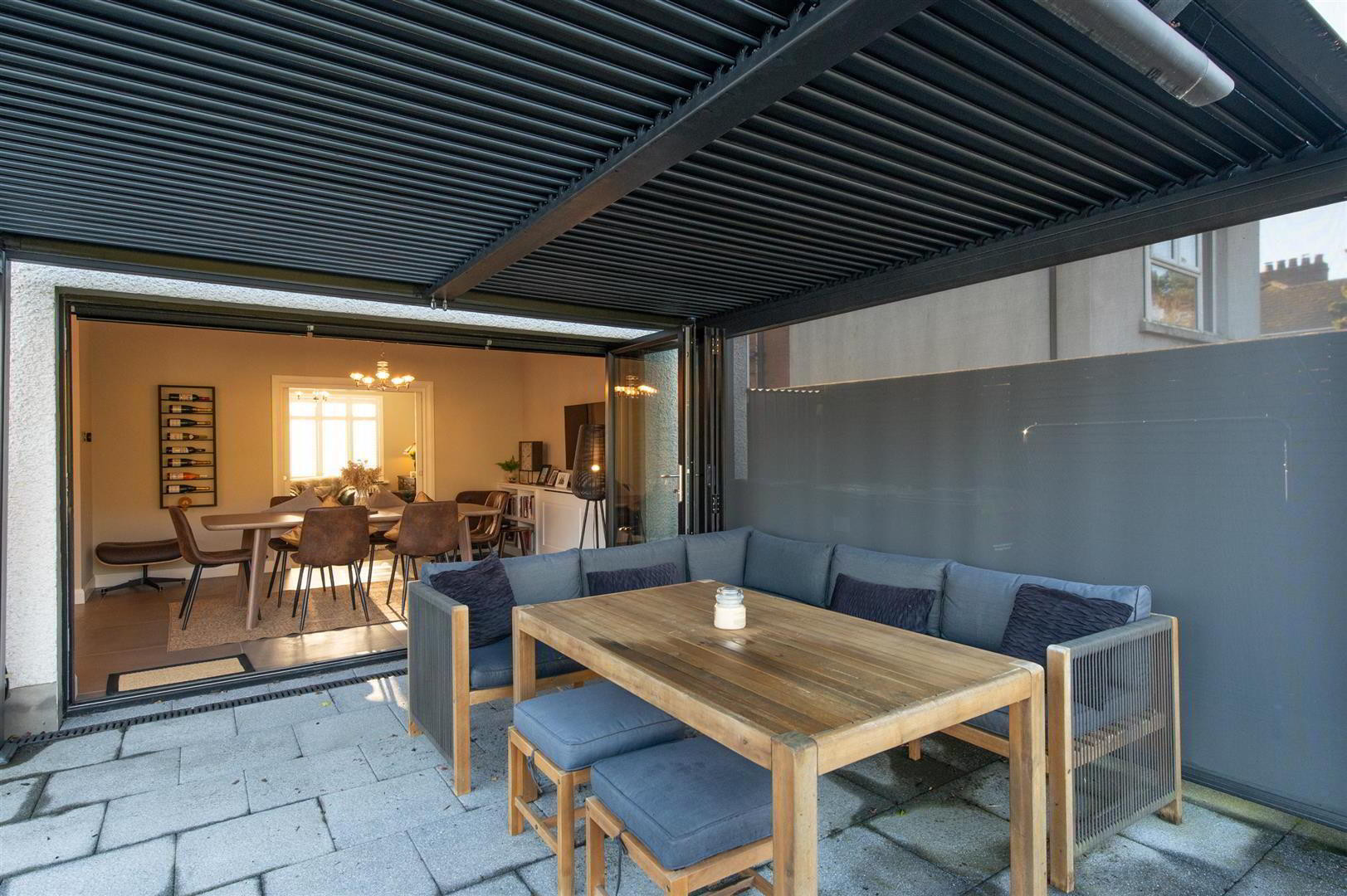 Casual dining area with built in cupboards, wired for flat screen, downlighters, built in folding door with electric blinds to patio area, feature pergola with electric heating, views towards Knockagh - UTILITY ROOM 2.29m x 1.83m