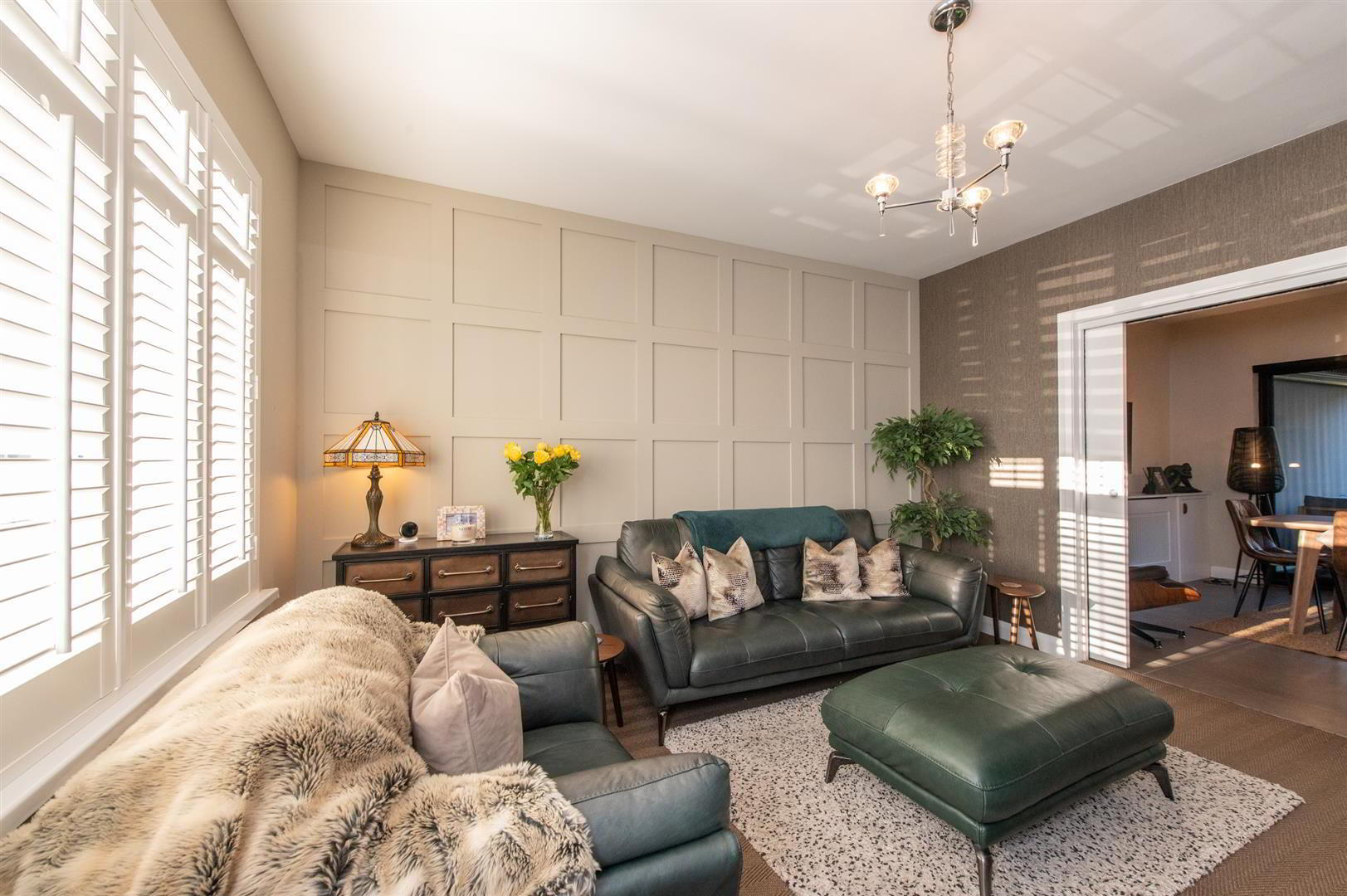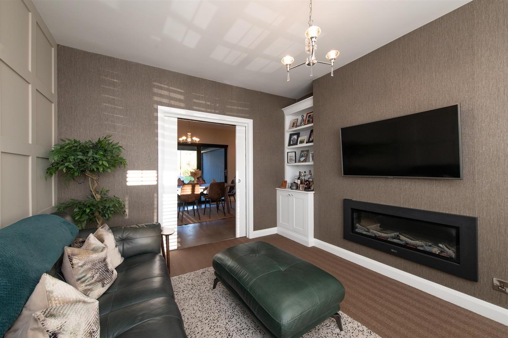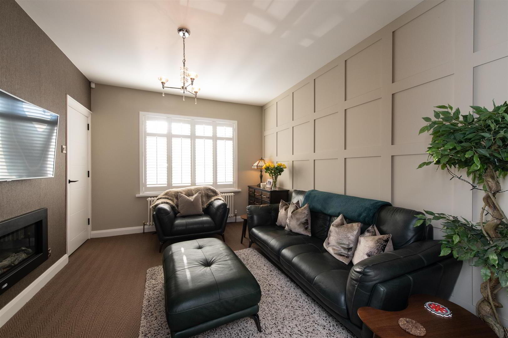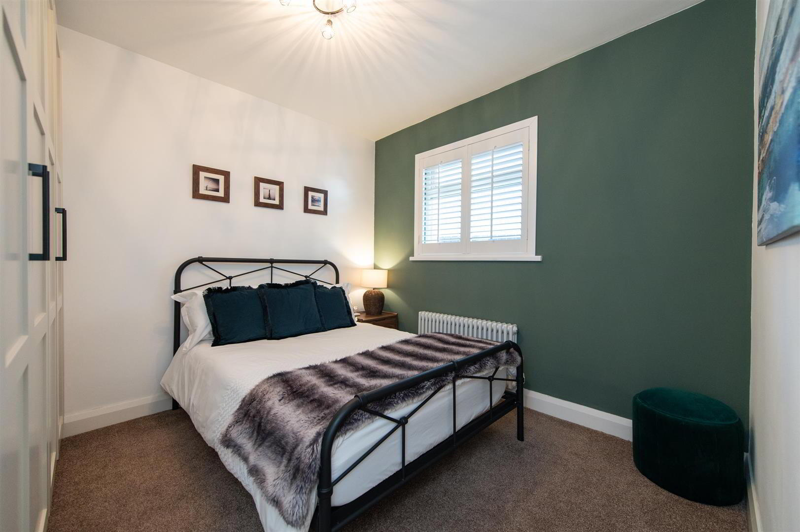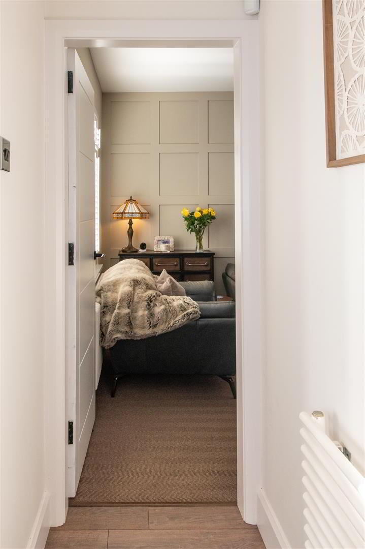 - Feature panelling, electric fire, feature radiator, wired for flat screen, built in cupboards and shelving, sliding pocket doors, shutter blinds