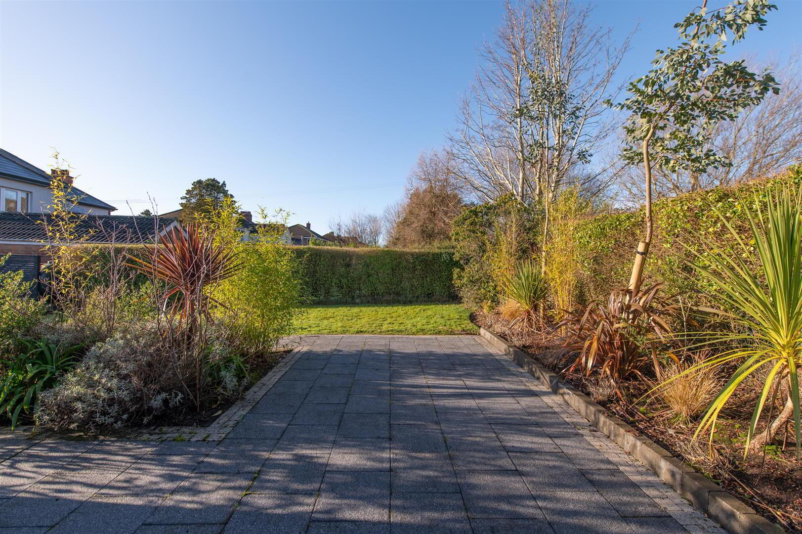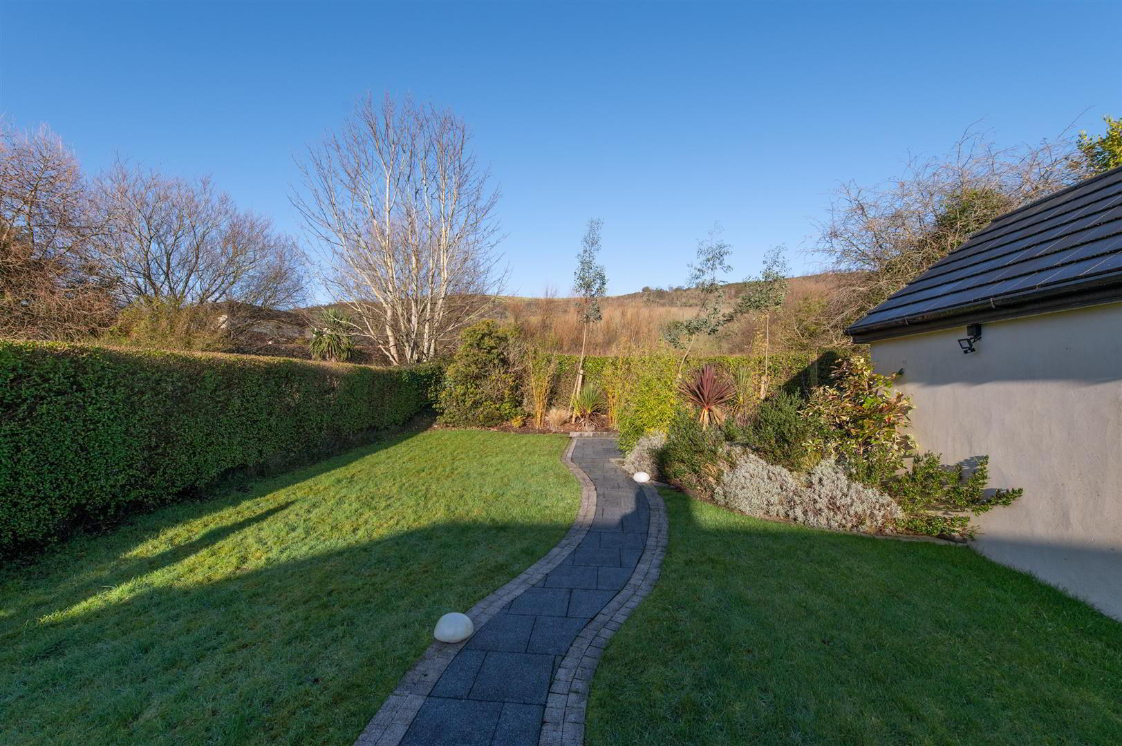 - Front in driveway, in lawn with plants, trees and shrubs, external plug socket