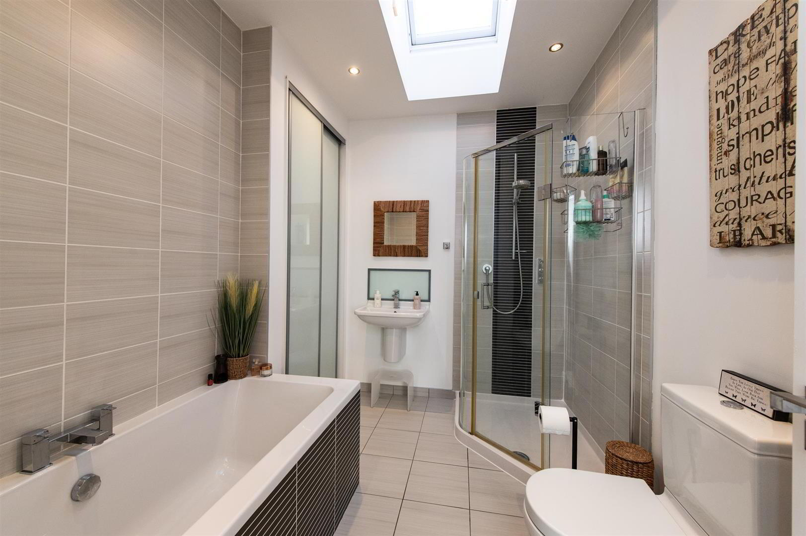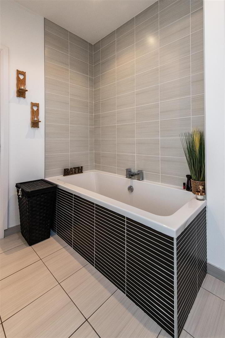 - Luxury white bathroom suite, built in bath with mixer tap, wall hung wash hand basin, larger corner glazed shower unit with controlled shower, low flush WC, linen cupboard with insulated copper cylinder, ceramic tiled flooring, electric Velux window, downlighters
