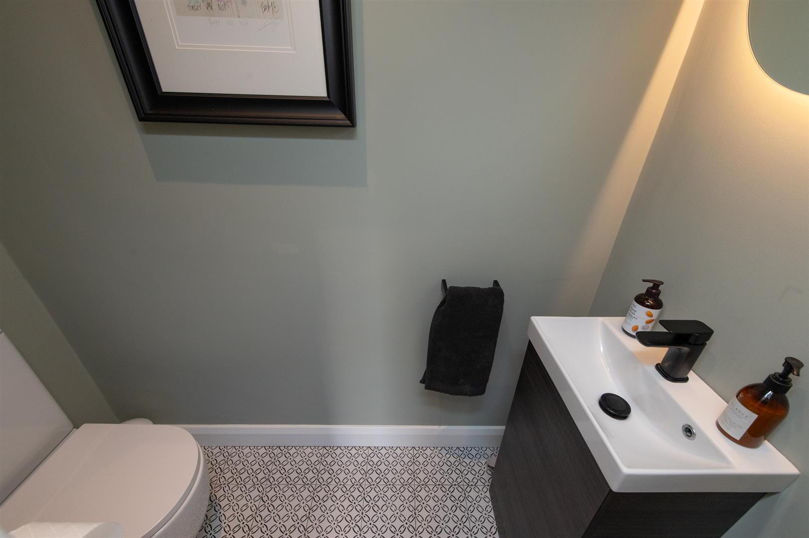 - Low flush WC, vanity unit with mixer tap, ceramic tiled flooring, feature mirror, downlighters