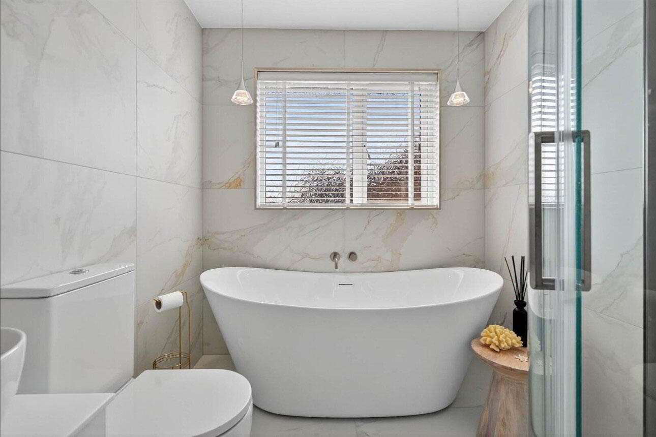 BATHROOM Modern white bathroom suite, oval bath with mixer tap, low flush W/C, display units, wash hand basin with mixer taps, shower unit with controlled shower and overhead rain shower, wall and floor tiling, modern radiator