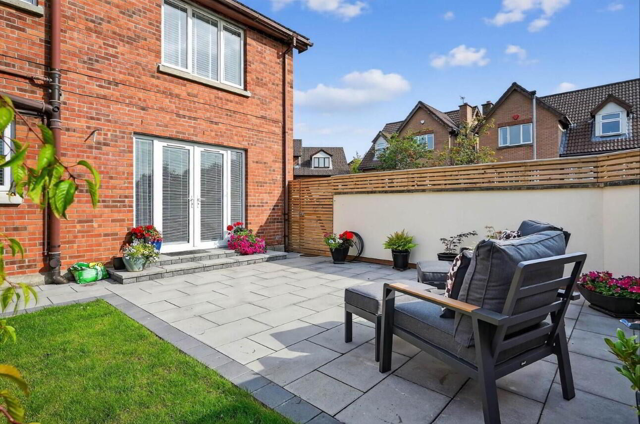 Rear: enclosed, paved patio area, plants, trees and shrubs, light and tap