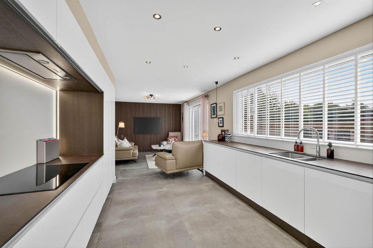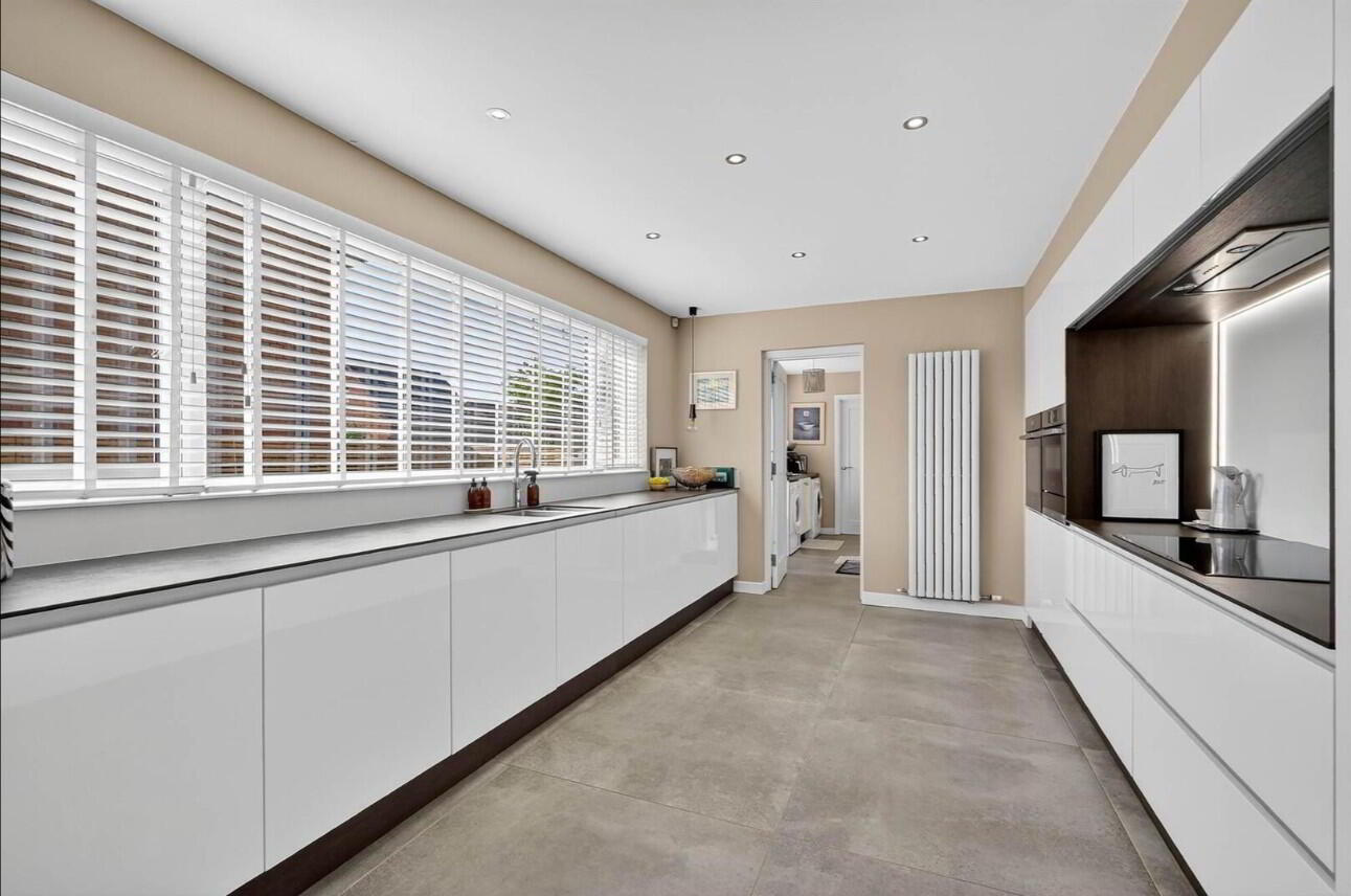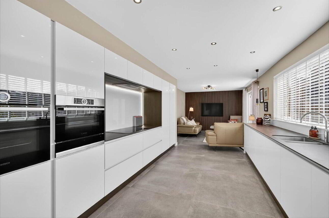 KITCHEN/ FAMILY ROOM 29' 3" x 10' 9" (8.92m x 3.28m) Range of high and low level high gloss units, luxury worksurfaces, feature sink unit with mixer tap, vegetable sink, inlaid hob unit with matching splash back, built in oven, microwave oven, extractor fan, concealed light, fridge downlighters, dishwasher, panelling, French doors with glazed side panel to garden, luxury floor tiling