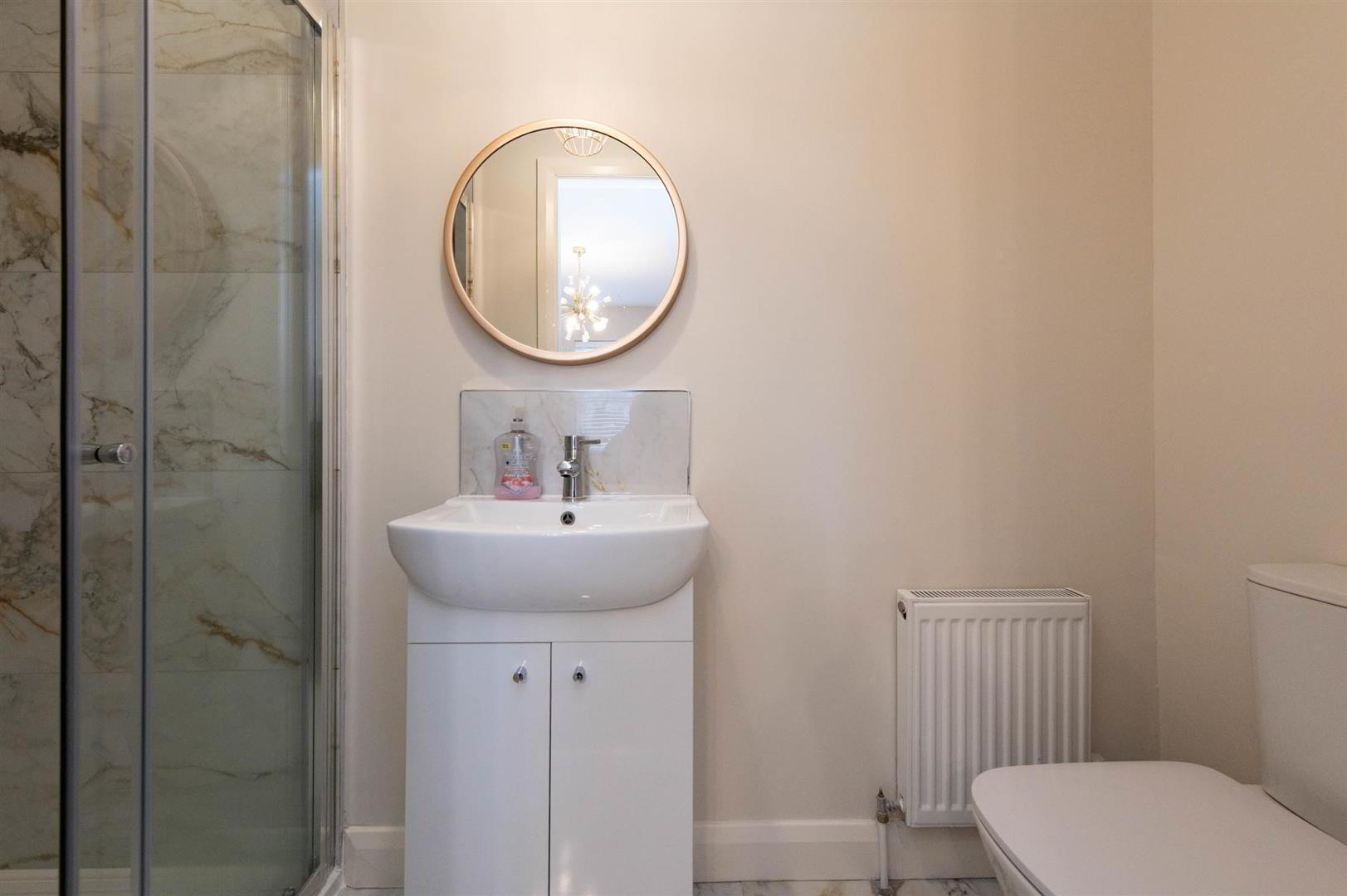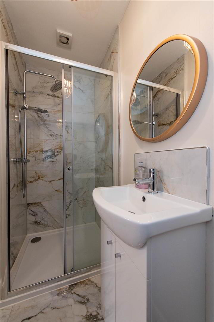 - Low flush W/C, vanity unit with mixer tap, glazed shower unit with controlled shower, tiling, ceramic tiled flooring, extractor fan