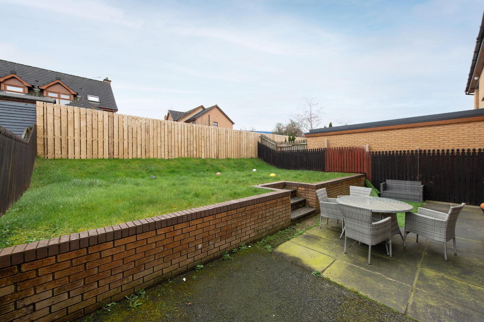 Safely enclosed rear garden with paved patio area. Outside light and tap. Double entrance gates