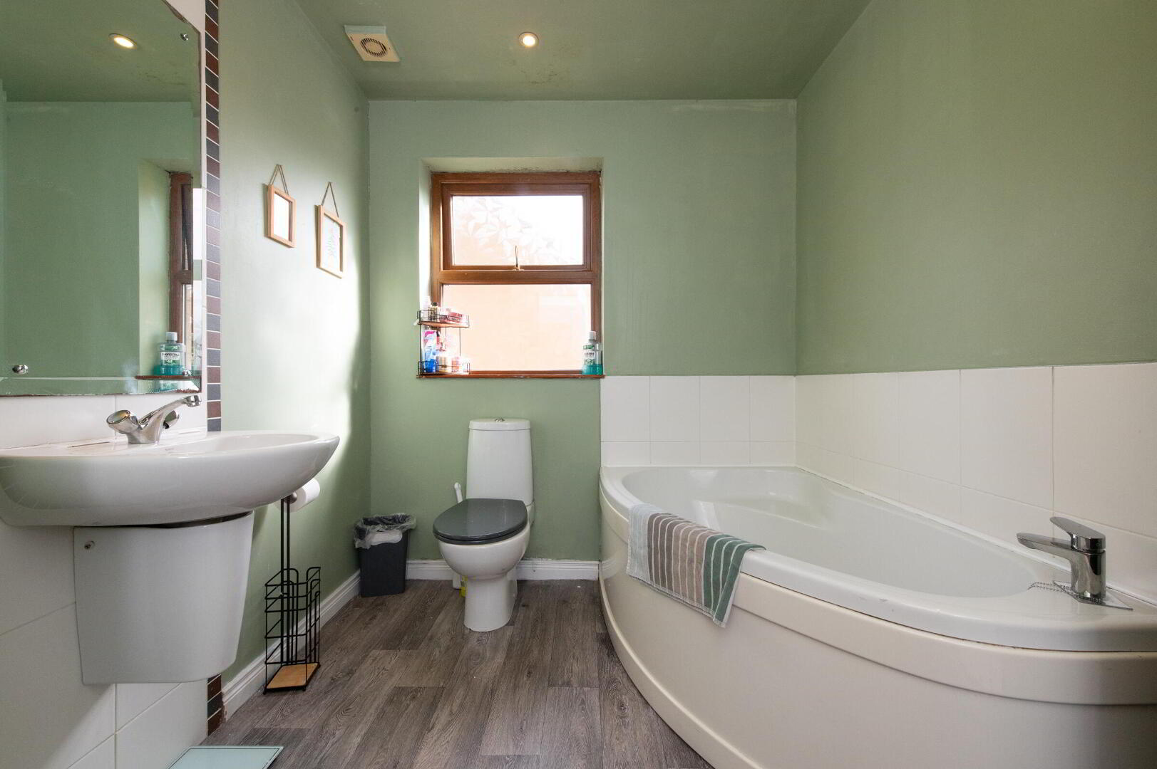 BATHROOM White suite. Panelled corner bath with mixer tap. Separate shower unit with thermostatically controlled shower. Wall hung wash hand basin. Low flush WC. Downlighters. Extractor fan. Feature Panelling. Tiling. Mirror.