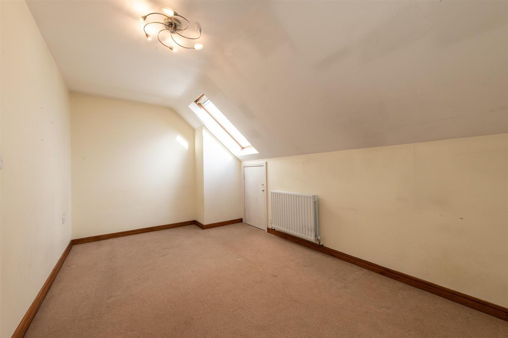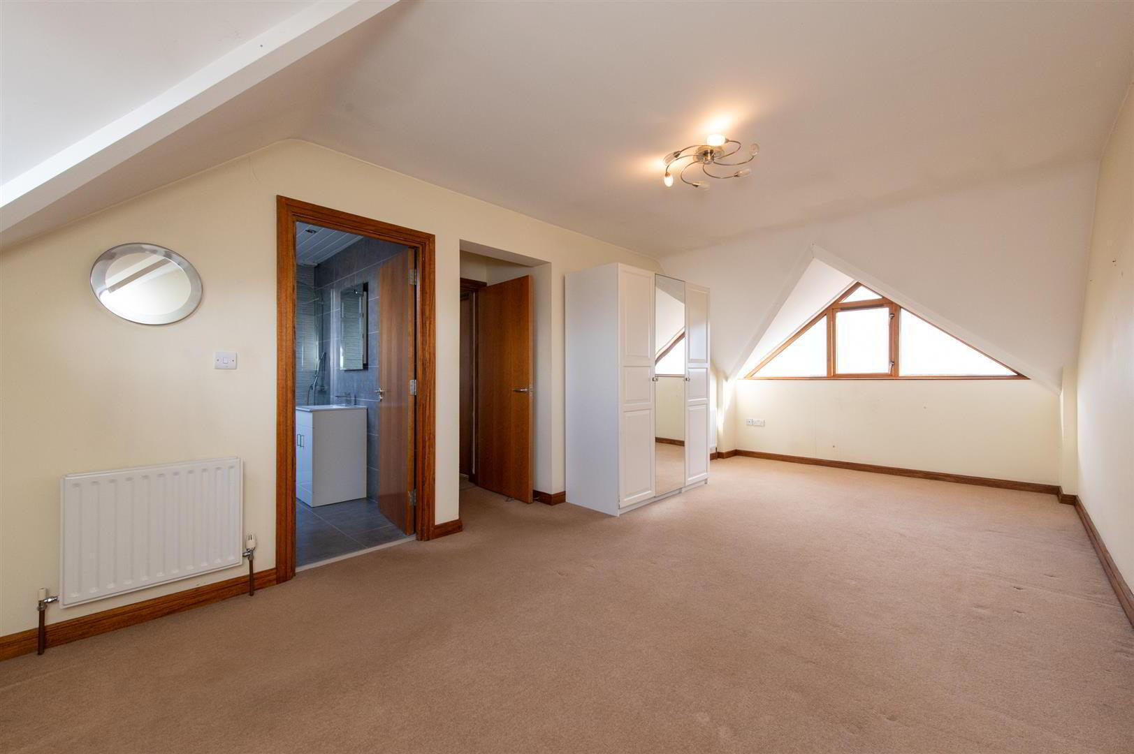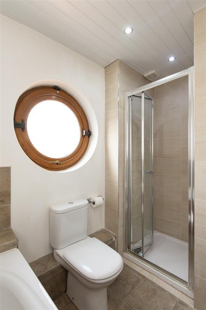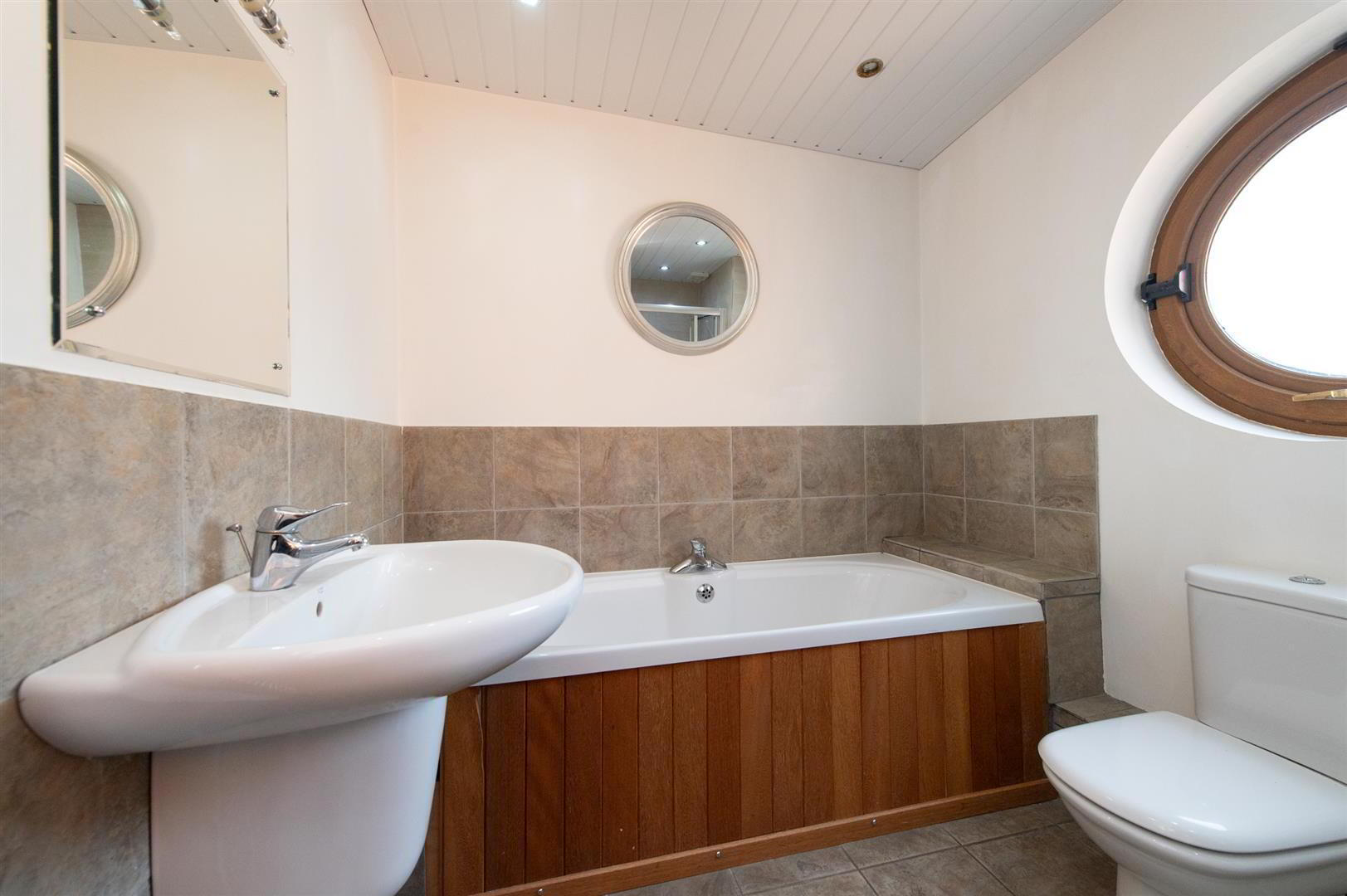 - White suite comprising panelled bath, glazed shower cubicle with thermostatic controlled shower, half pedestal wash hand basin, low flush W/C, wall tiling, ceramic tiled flooring, chrome heated towel rail, PVC ceiling, downlighters, feature porthole window