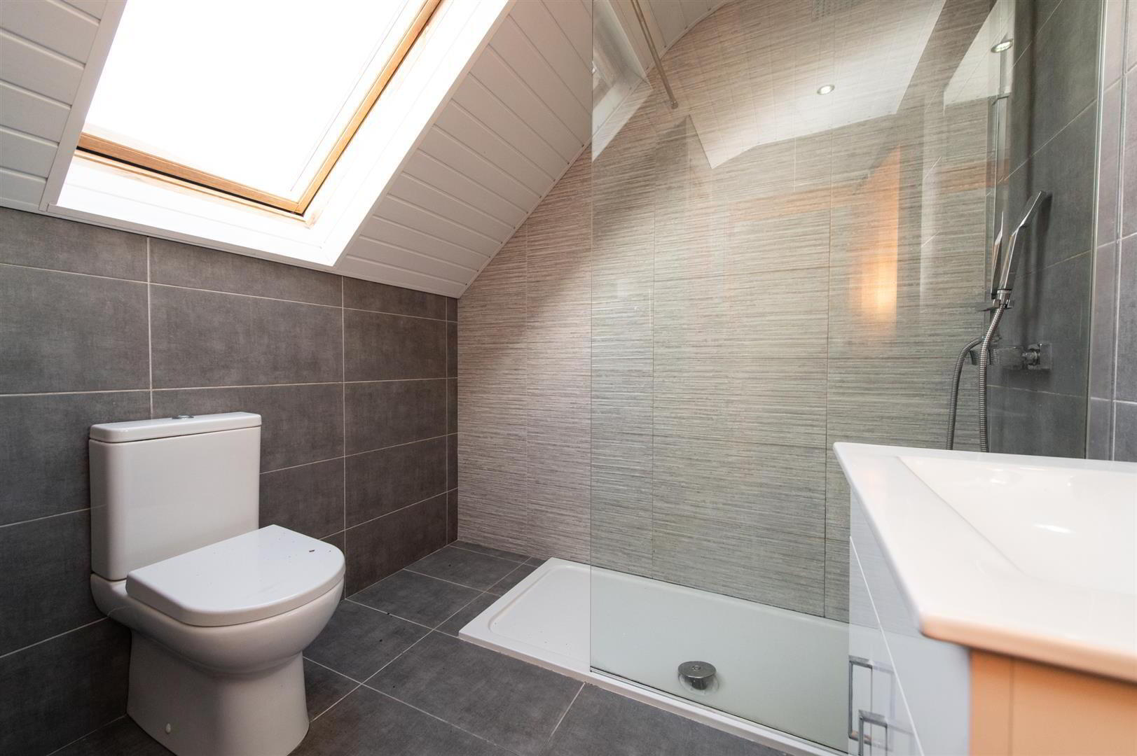 - Walk in shower area with feature rainfall shower, separate handheld shower, low flush W/C, vanity sink unit, chrome heated towel rail, wall tiling, ceramic tiled flooring, PVC panelled ceiling, downlighters, extractor fan, shelved linen cupboard