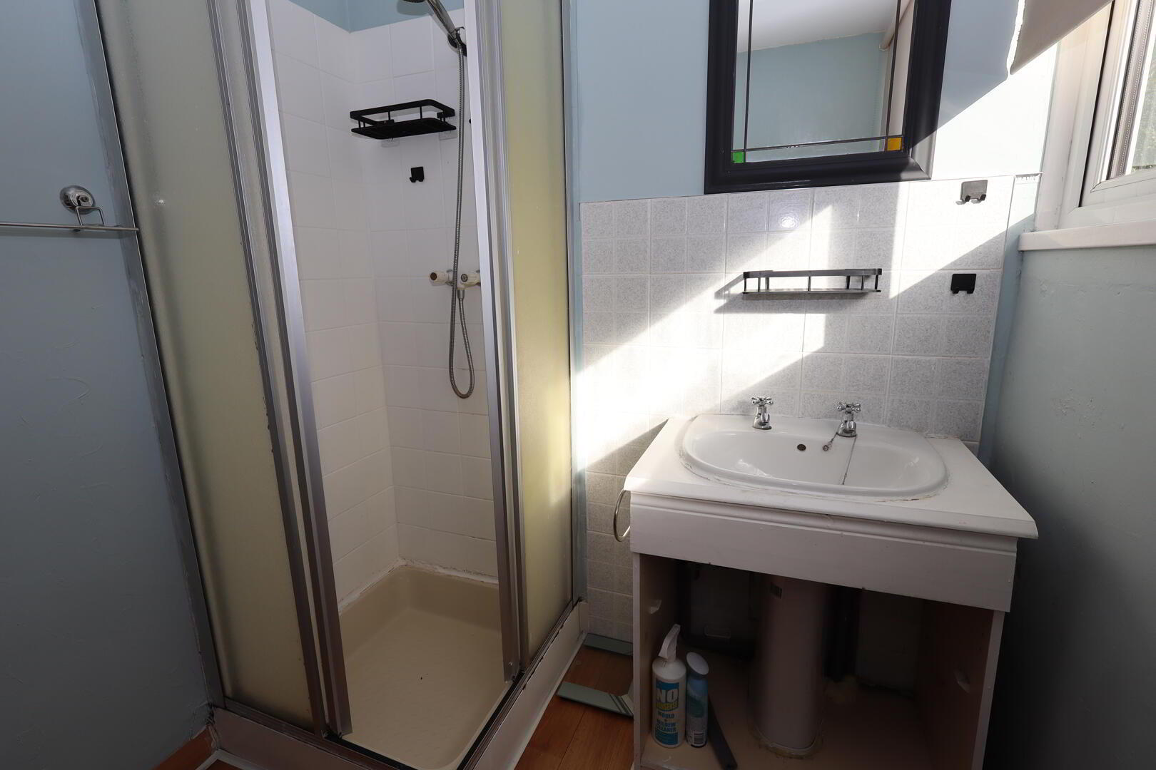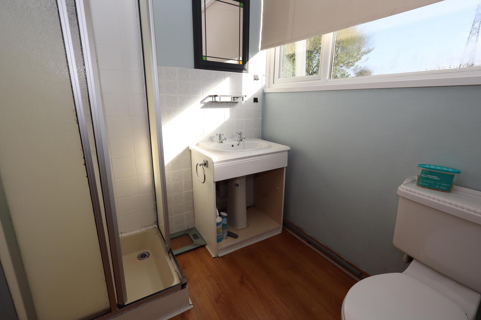 Glazed shower cubicle with thermostatic controlled shower with electric water feed, pedestal wash hand basin, low flush W/C, laminate wood flooring, wall tiling