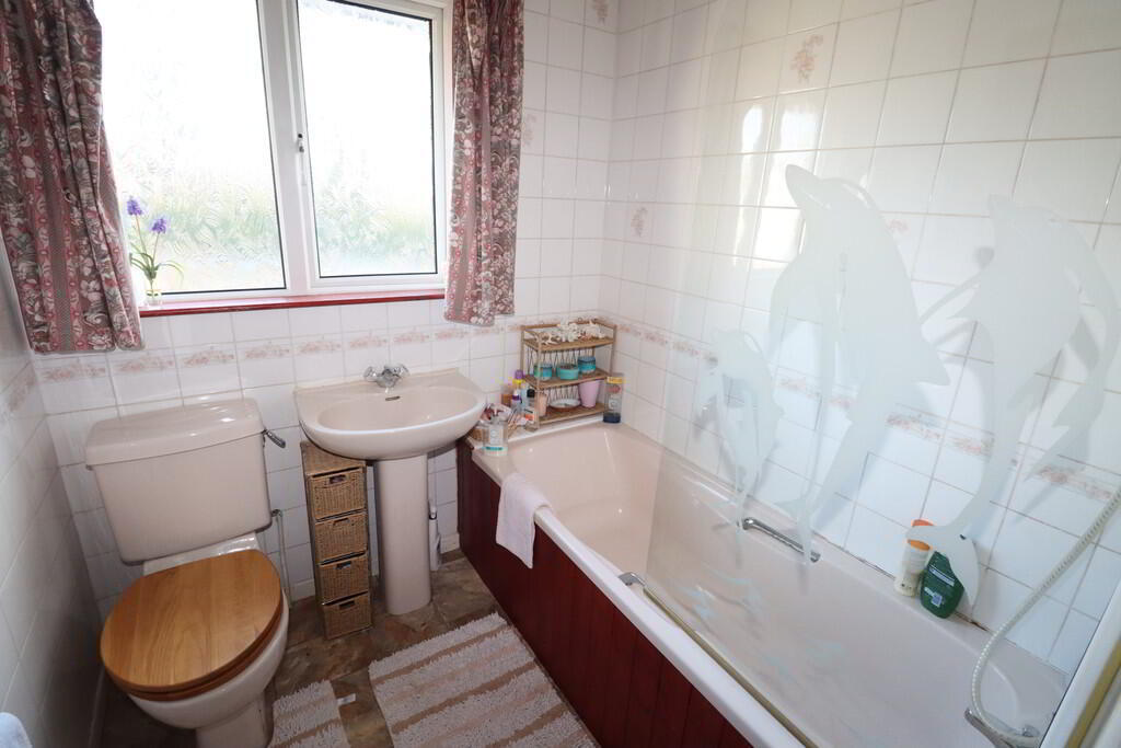 BATHROOM Wooden panelled bath unit, glazed shower screen, wall tiling, low flush W/C, pedestal wash hand basin