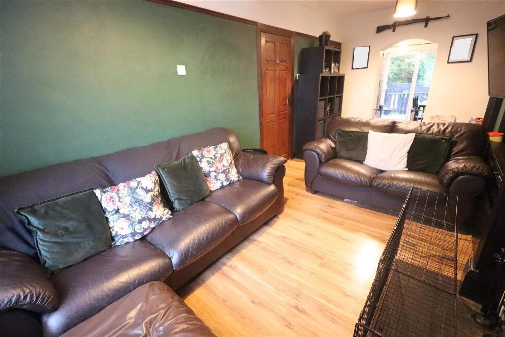 - Wood effect laminate flooring, wood front door with glazed inset panel, understairs storage cupboard unit, wall panelling