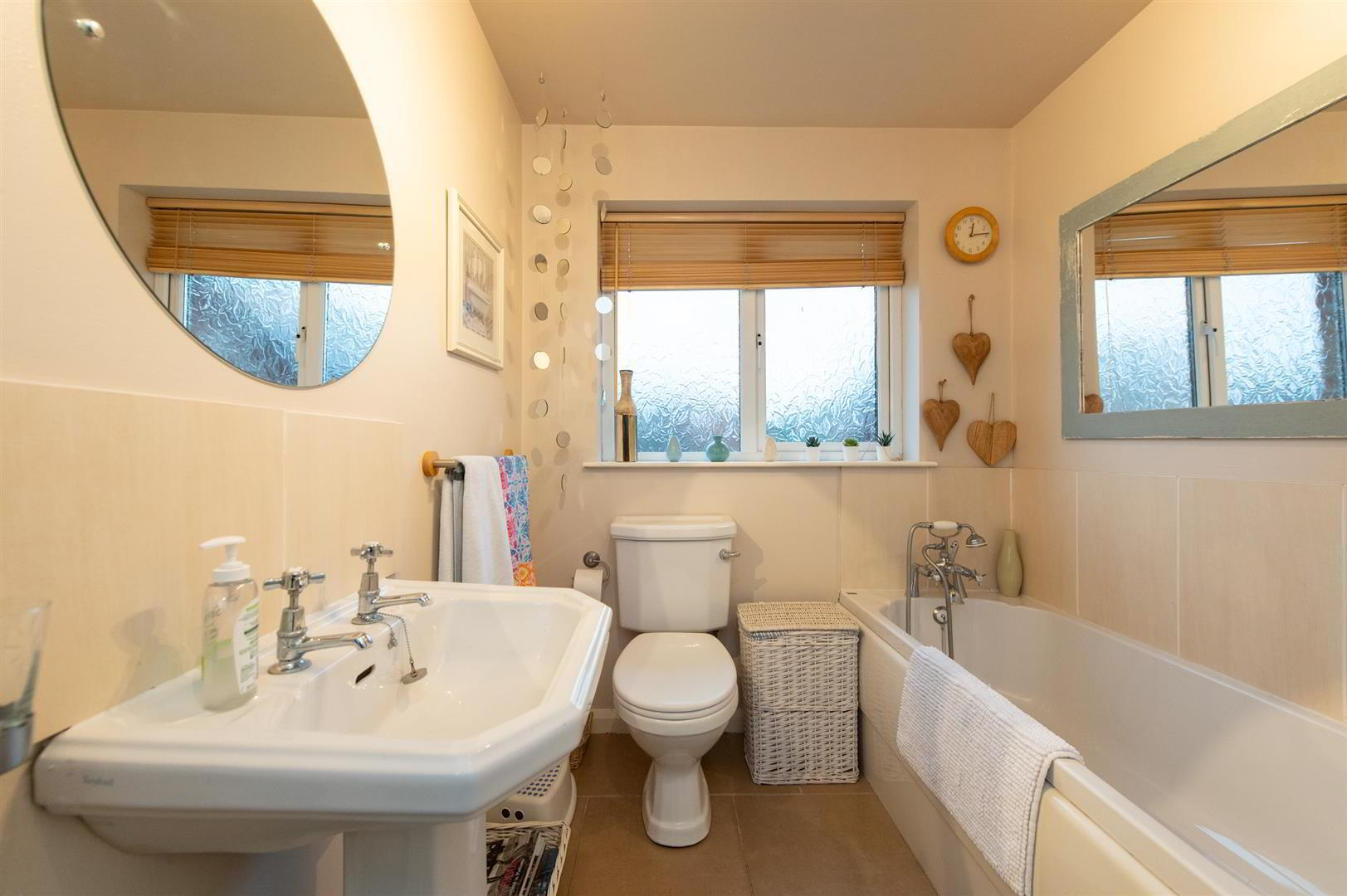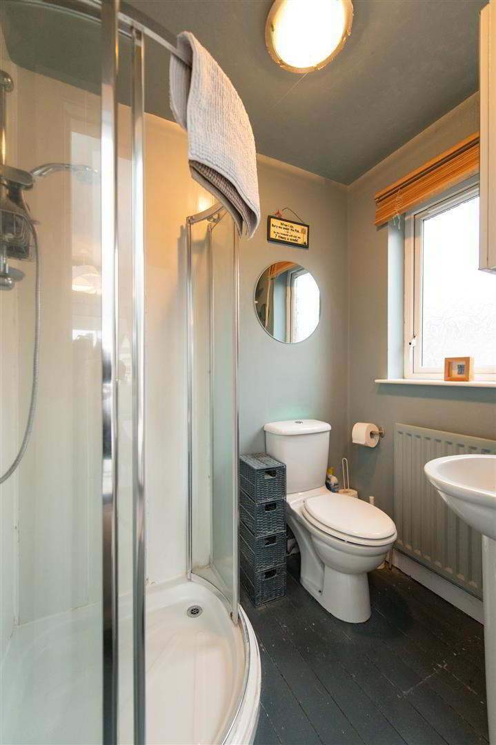 - Low flush W/C, pedestal wash hand basin, corner glazed shower unit with controlled shower, uPVC tiling, painted floorboards