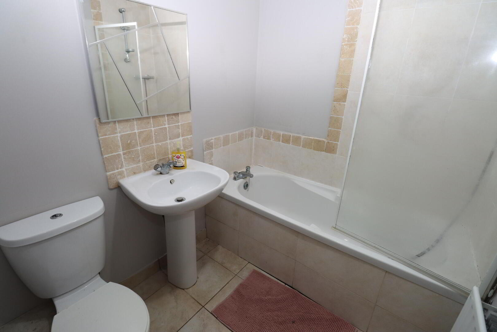 BATHROOM 3 Piece suite comprising push button W/C, pedestal wash hand basin with mixer tap, panelled bath with mixer tap, thermostatic shower unit, shower screen, part wall tiling, ceramic tiled flooring, extractor fan