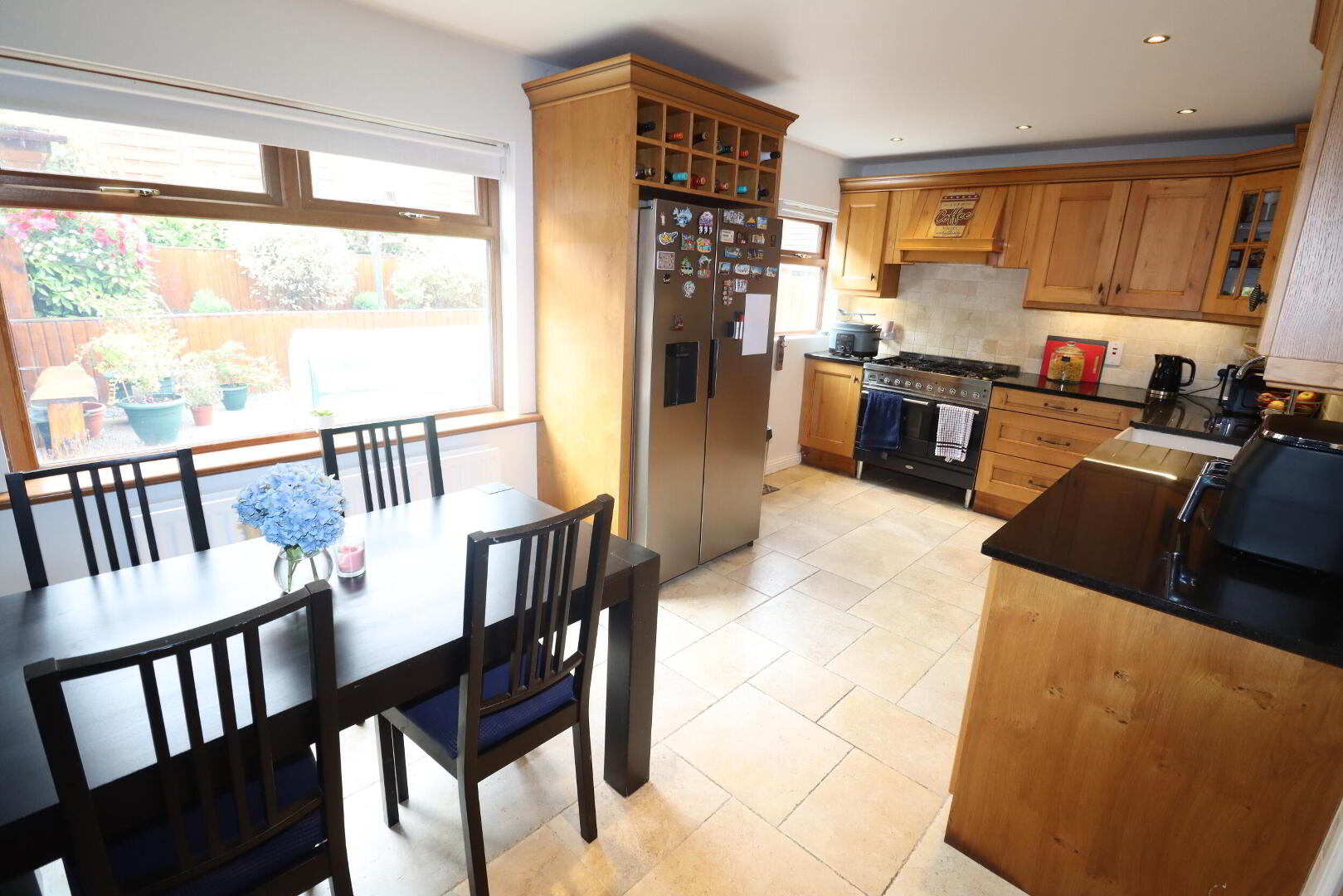 KITCHEN/ DINING ROOM 17' 3" x 9' 8" (5.26m x 2.95m) Range of high and low level units, luxury granite worktops, Belfast sink with mixer taps, glazed display cabinet, range cooker, gas hob, extractor hood, plumbed for washing machine, space for dishwasher, ceramic tiled flooring, wall tiling, uPVC back door, downlighters