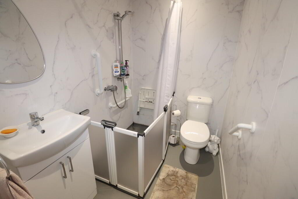 WET ROOM Low flush W/C, pedestal wash hand basin, thermostatically controlled shower with chrome shower fitting