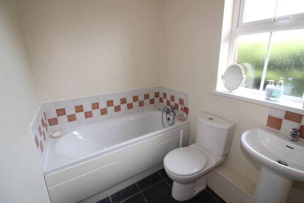 BATHROOM White suite panelled bath with mixer tap, low flush W/C, pedestal wash hand basin, ceramic tiled flooring, shaver point, extractor fan