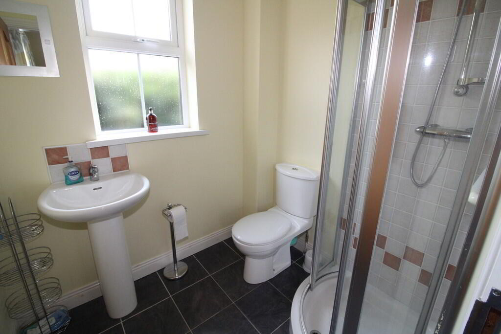 ENSUITE SHOWER ROOM Low flush W/C, pedestal wash hand basin, shower unit with controlled shower, extractor fan, ceramic tiled flooring