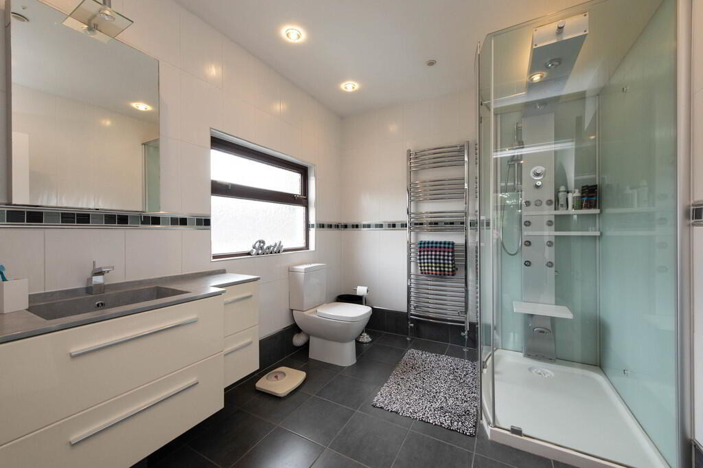 ENSUITE Low flush W/C, vanity unit, shower unit with electric shower, heated towel rail, downlighters