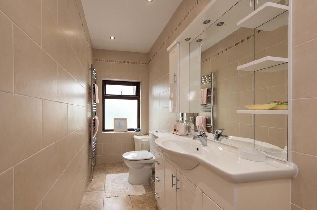 ENSUITE SHOWER ROOM Low flush W/C, vanity unit, shower unit with electric shower, downlighters, extractor fan, ceramic tiled flooring, heated towel rail