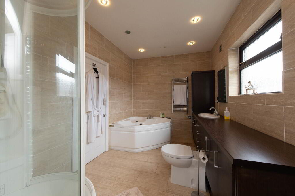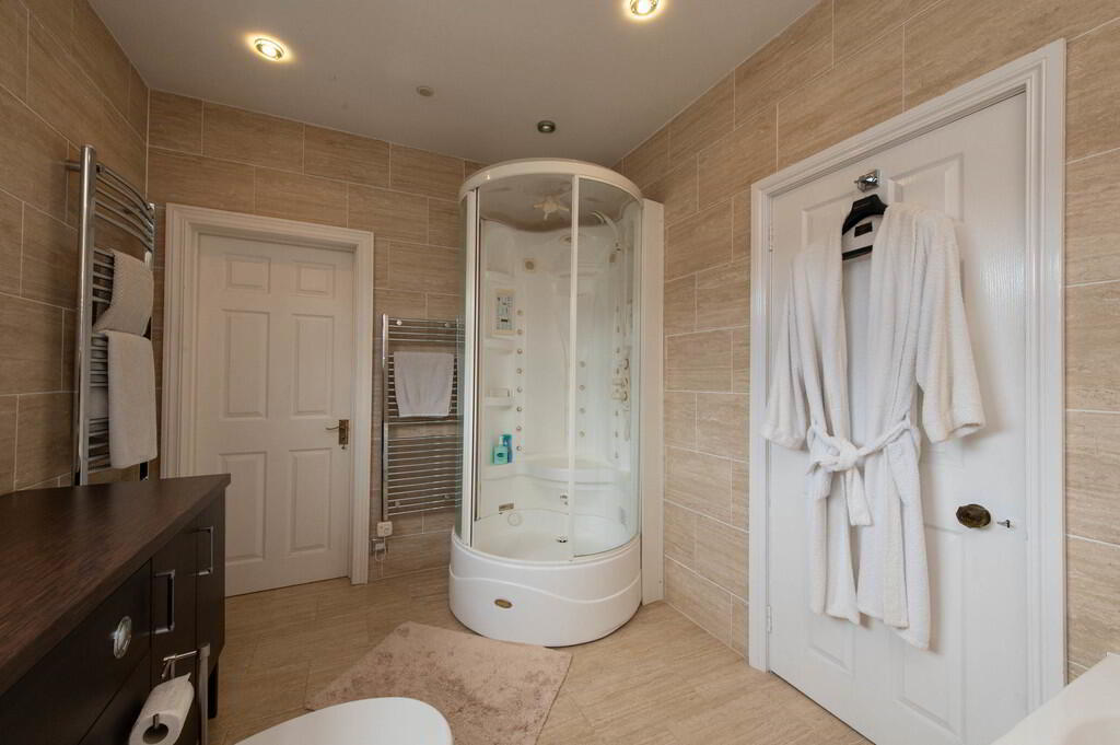ENSUITE SHOWER ROOM White suite, corner bath, Jacuzzi, built in units, wash hand basin, shower unit with controlled shower and aqua jets, W/C, fully tiled walls, heated towel rail