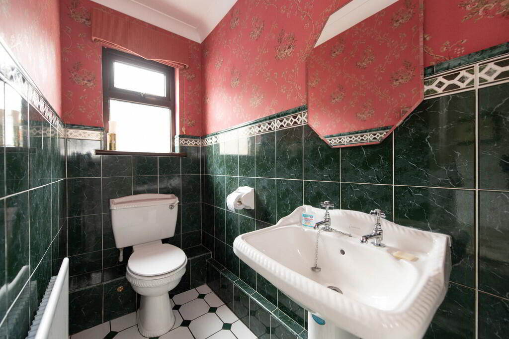 CLOAKROOM Built in cupboard, ceramic tiled flooring, low flush W/C, pedestal wash hand basin, wall tiling, heated towel rail