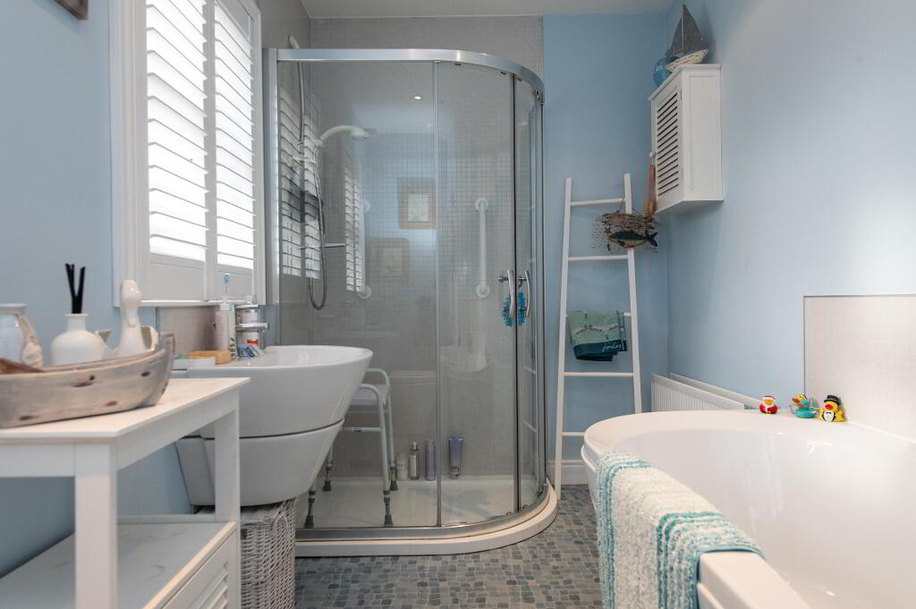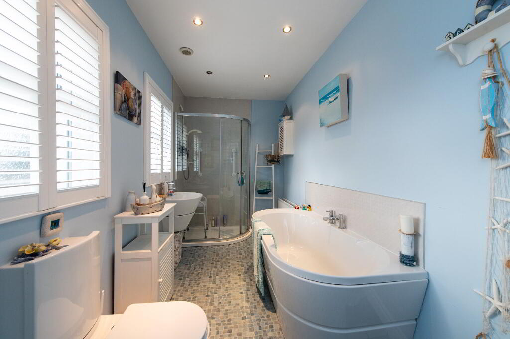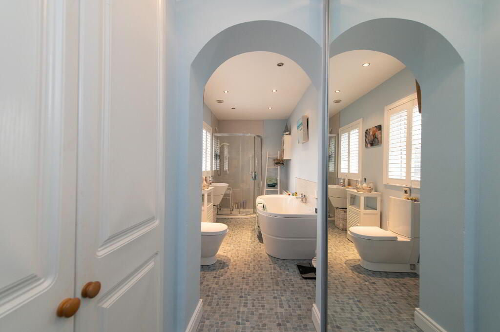 LUXURY BATHROOM Low flush W/C, wash hand basin, corner glazed shower unit with controlled shower, built in bath, access to floored roofspace