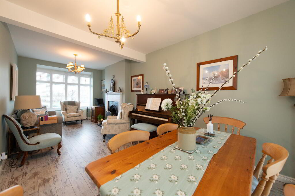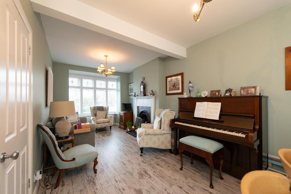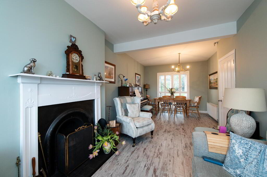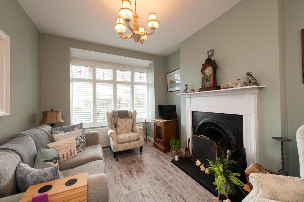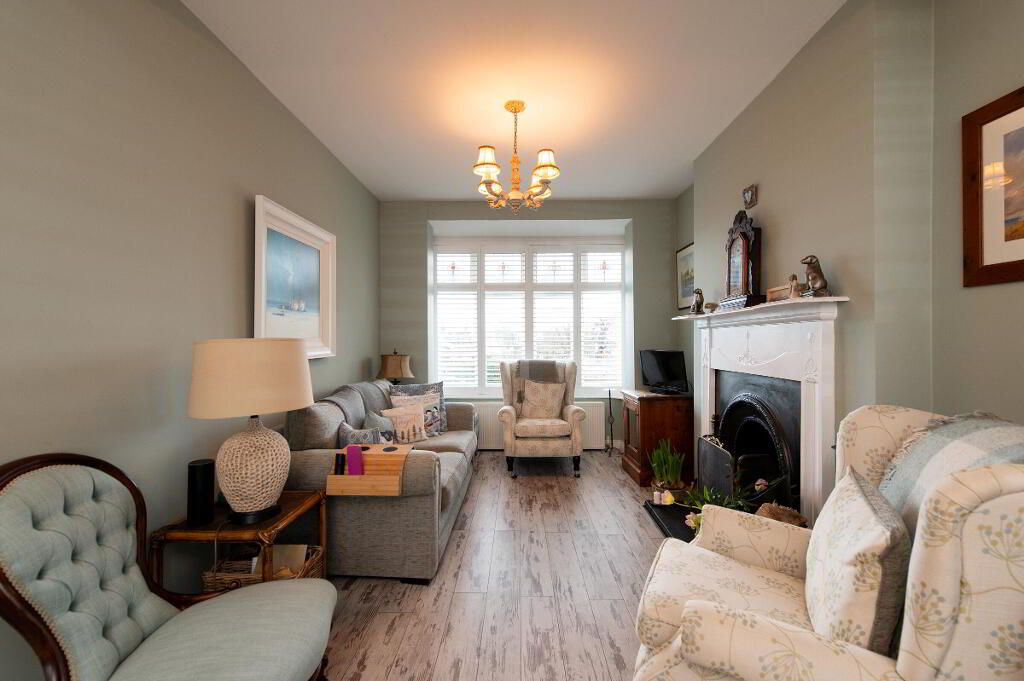 LOUNGE 23' 6" x 9' 6" (7.16m x 2.9m) Laminate wood flooring, feature fireplace with open fire, stained glass window, view of Belfast Lough.