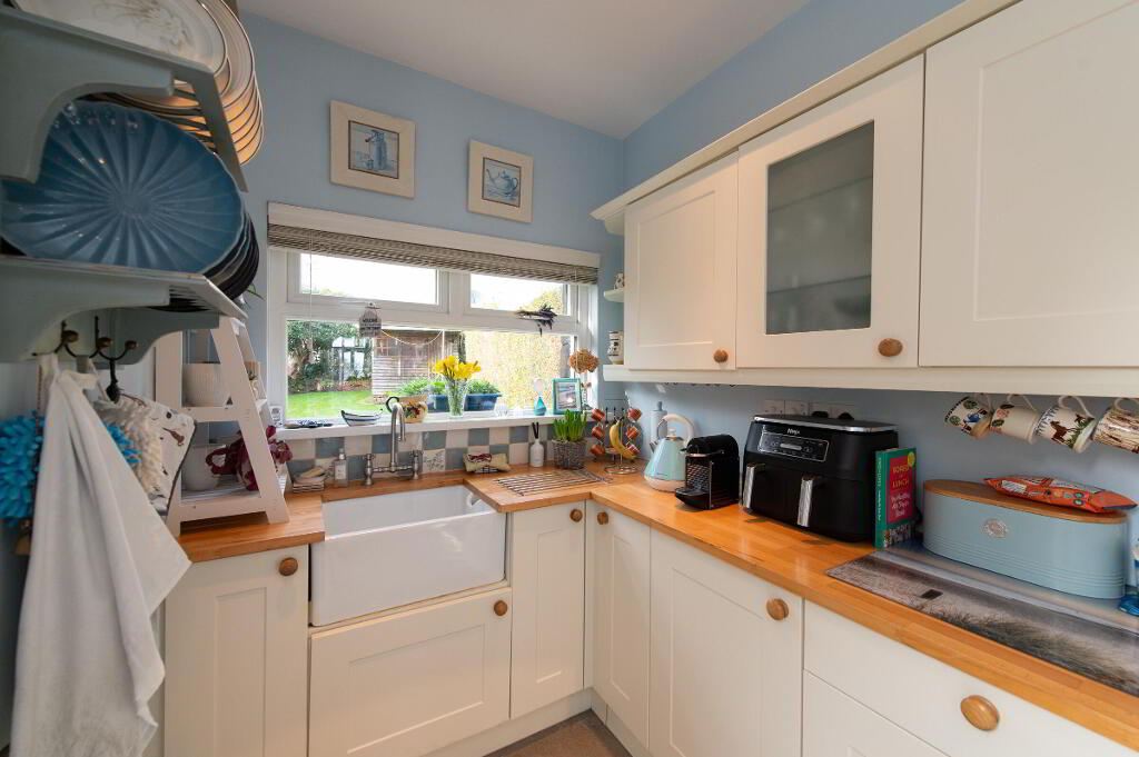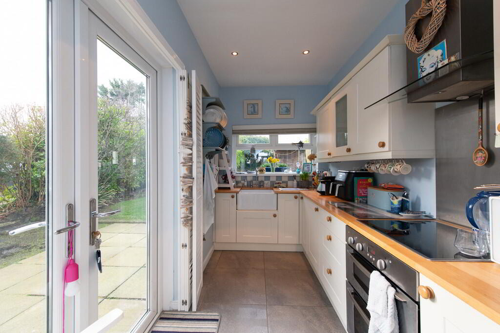 KITCHEN 20' 6" x 6' 0" (6.25m x 1.83m) Modern fitted kitchen with range of high and low level units, solid worksurfaces, Belfast sink unit with mixer tap, indesit gas hob, built in double oven, plumbed for dishwasher, plumbed for washing machine, space for tumble dryer, ceramic tiled flooring