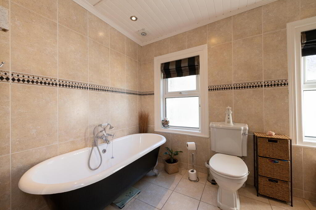 LUXURY BATHROOM Luxury bathroom suite comprising iron cast roll top bath with mixer taps and hand held shower, low flush WC, pedestal wash hand basin, corner glazed shower unit with rain shower, tiling, ceramic tiled flooring