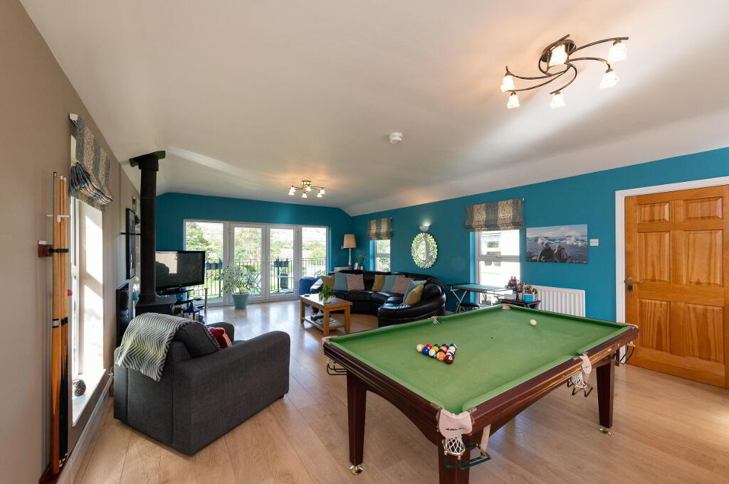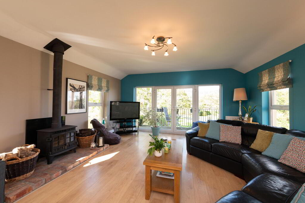 ENTERTAINMENTS LOUNGE/ANNEX FOR RELATIVE/HOME WORKING AREA 30' 9" x 16' 5" (9.37m x 5m) Laminate wood flooring, log burning stove, sink enclosed in oak cabinet, French doors to balcony enjoying views of Knockagh and Belfast Lough