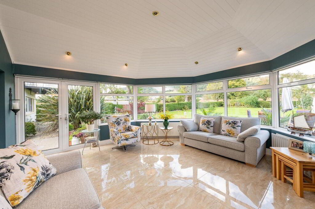 SUNROOM 16' 4" x 15' 9" (4.98m x 4.8m) Polished tiled flooring, gas stove, downlighters, view of Knockagh