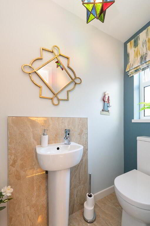 CLOAKS Low flush WC, pedestal wash hand basin, tiling, polished tiled flooring