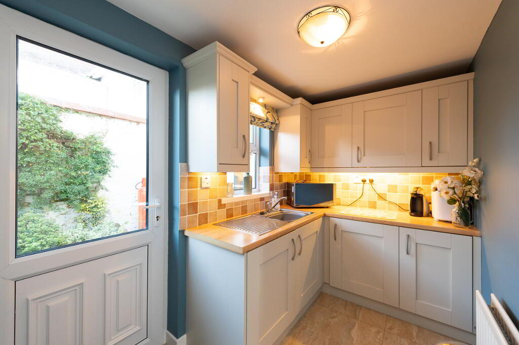 UTILITY ROOM 9' 6" x 5' 9" (2.9m x 1.75m) Range of units, stainless steel sink unit with mixer taps, tiling, polished tiled flooring, uPVC door to rear