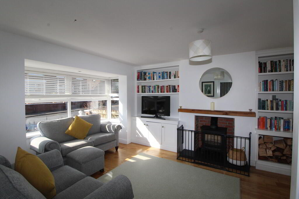 LOUNGE 16' 2" x 12' 5" 9 (into bay) (4.93m x 3.78m) Polished wood flooring, wood burning fire, slate hearth, hardwood mantel, built in bookcase, pocket doors to: