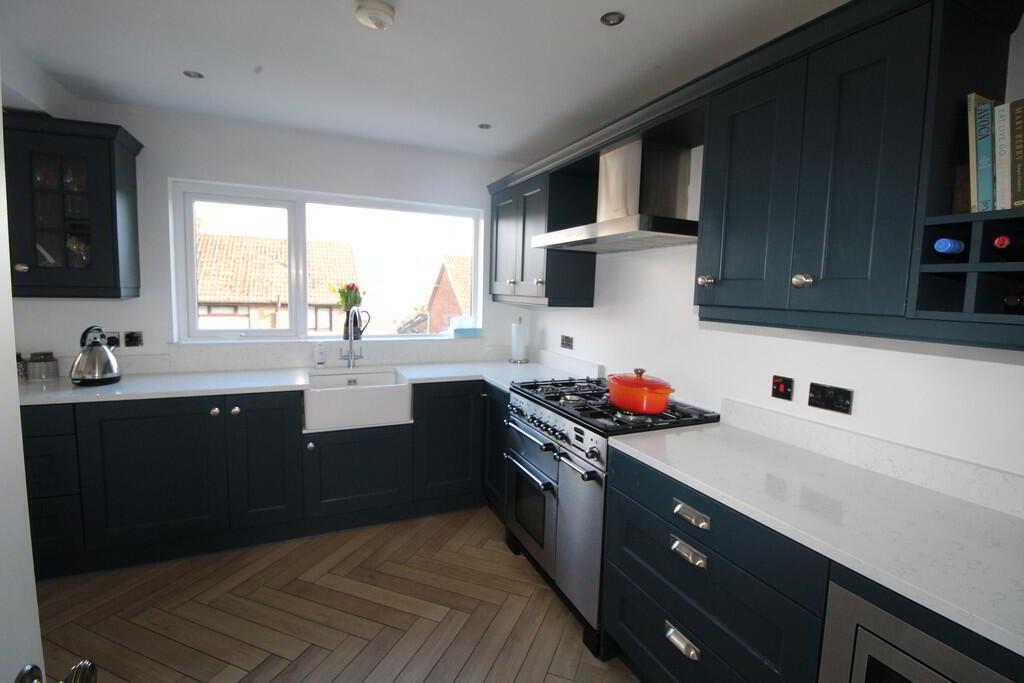 KITCHEN 19' 8" x 11' 0" (5.99m x 3.35m) Range of high and low level units, marble worksurfaces, stainless steel extractor fan, Jawbox sink with mixer tap including single drainer, display units, microwave, plumbed for washing machine, Herringbone wood flooring, French doors to rear, downlighters